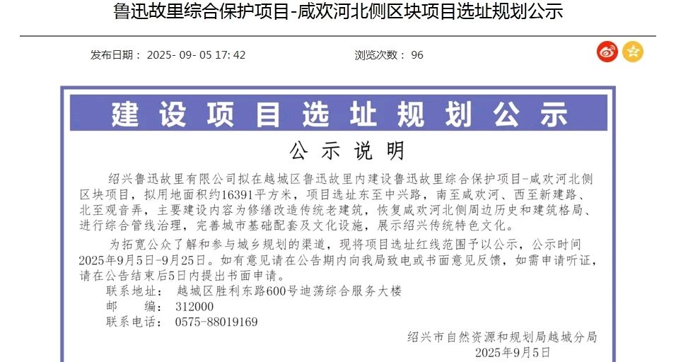 日前,在越城区官方网站上,鲁迅故里综合保护项目-咸欢河北侧区块项目选址规划公示。