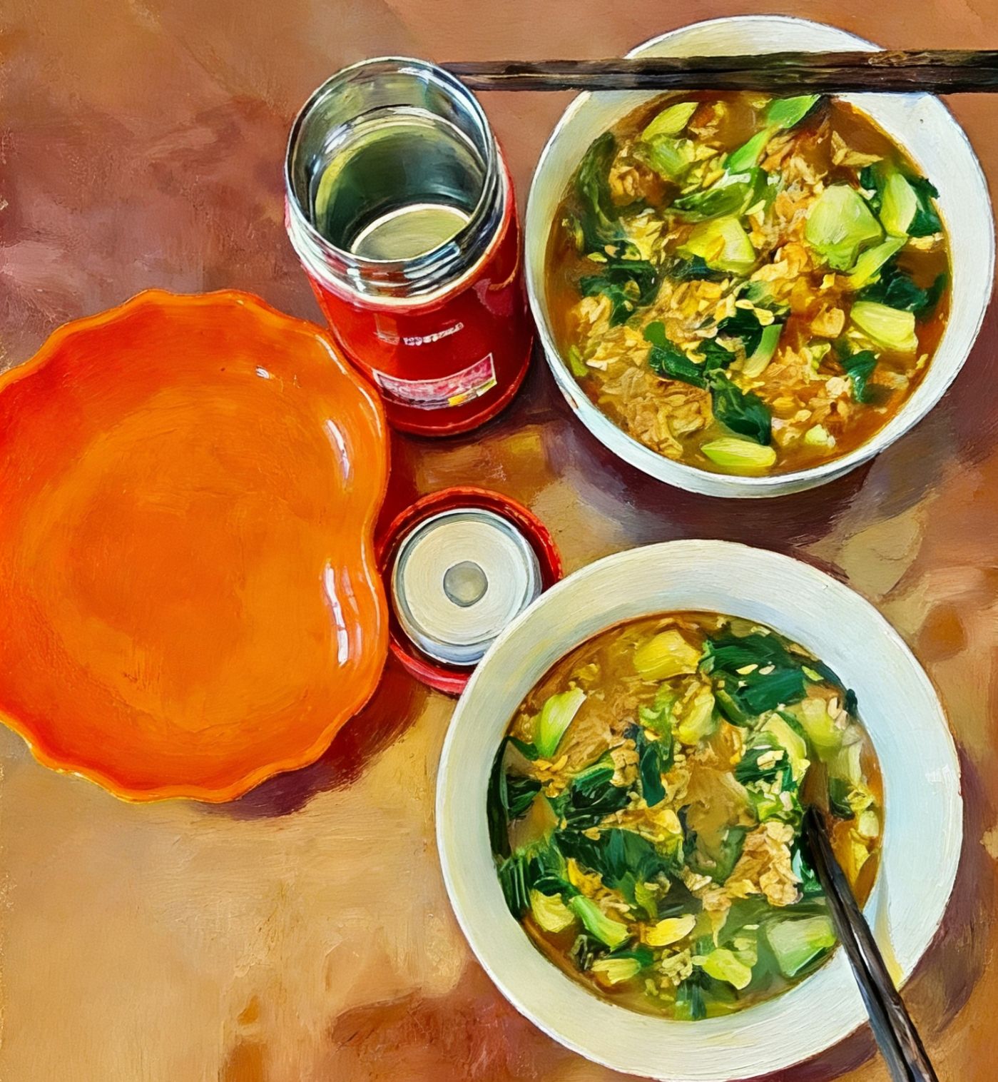 此刻早餐吃的是昨晚吃剩鸭肉卤水做调料煮的菜熬饭。