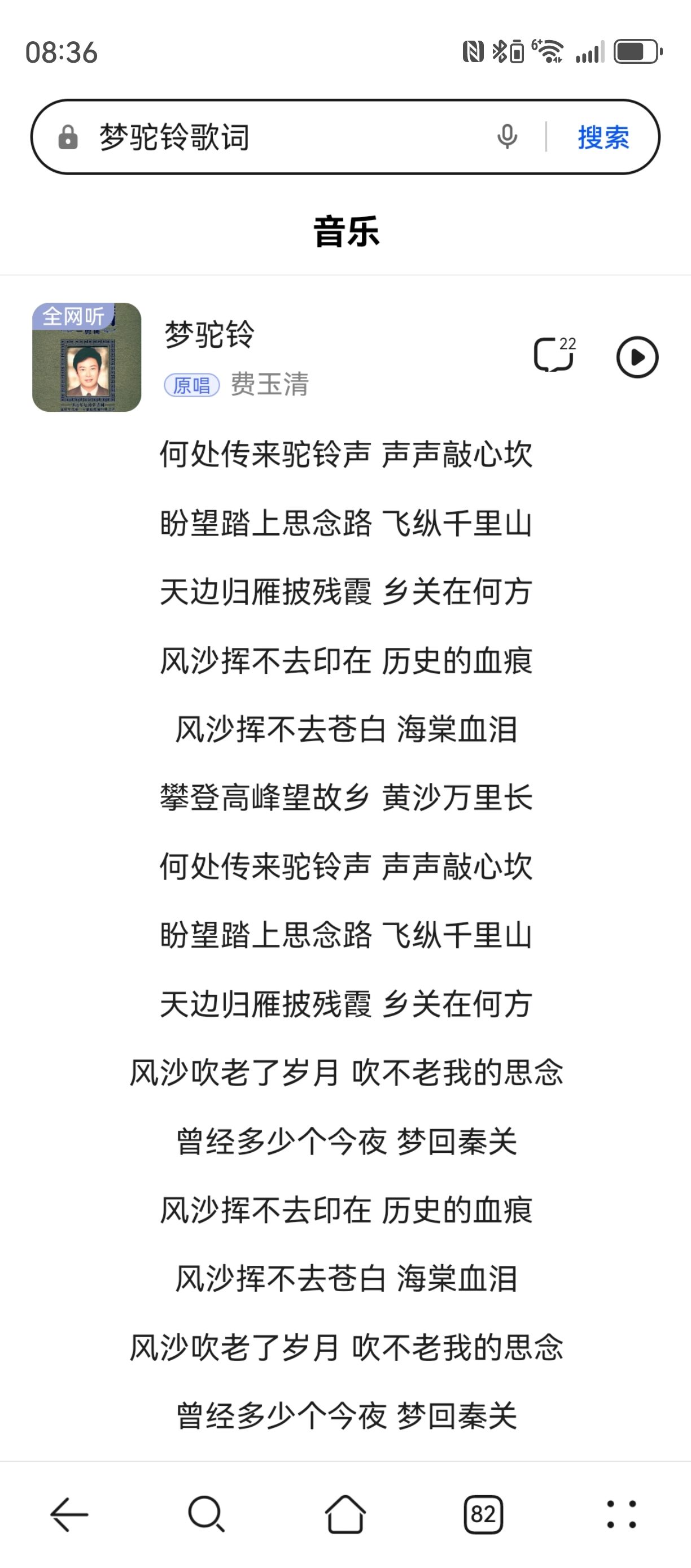 分享此刻完整的一首费玉清的《梦驼铃》,也是我特别喜欢听的一首歌曲。这首歌说的是在外蒙古,秦关,驼铃,黄沙都是暗指蒙古,还有外蒙古在的时候,中国地图形状像海棠,缺了外蒙古就好像在海棠上面砍了一刀,所以有了海棠血泪!