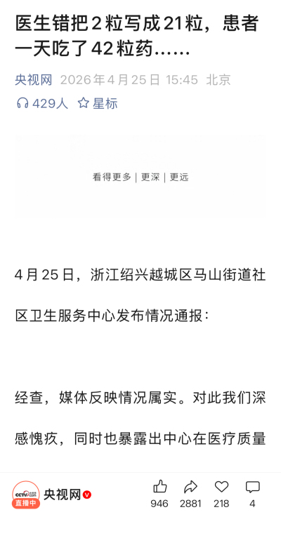越过越好:这位大妈估计没有超量服用药片的, 只不过家属发现医院这个错误趁机敲诈而已! 但卫生院犯这种低级错误也必须赔偿加处罚当事责任人!(2026-04-25 13:48)