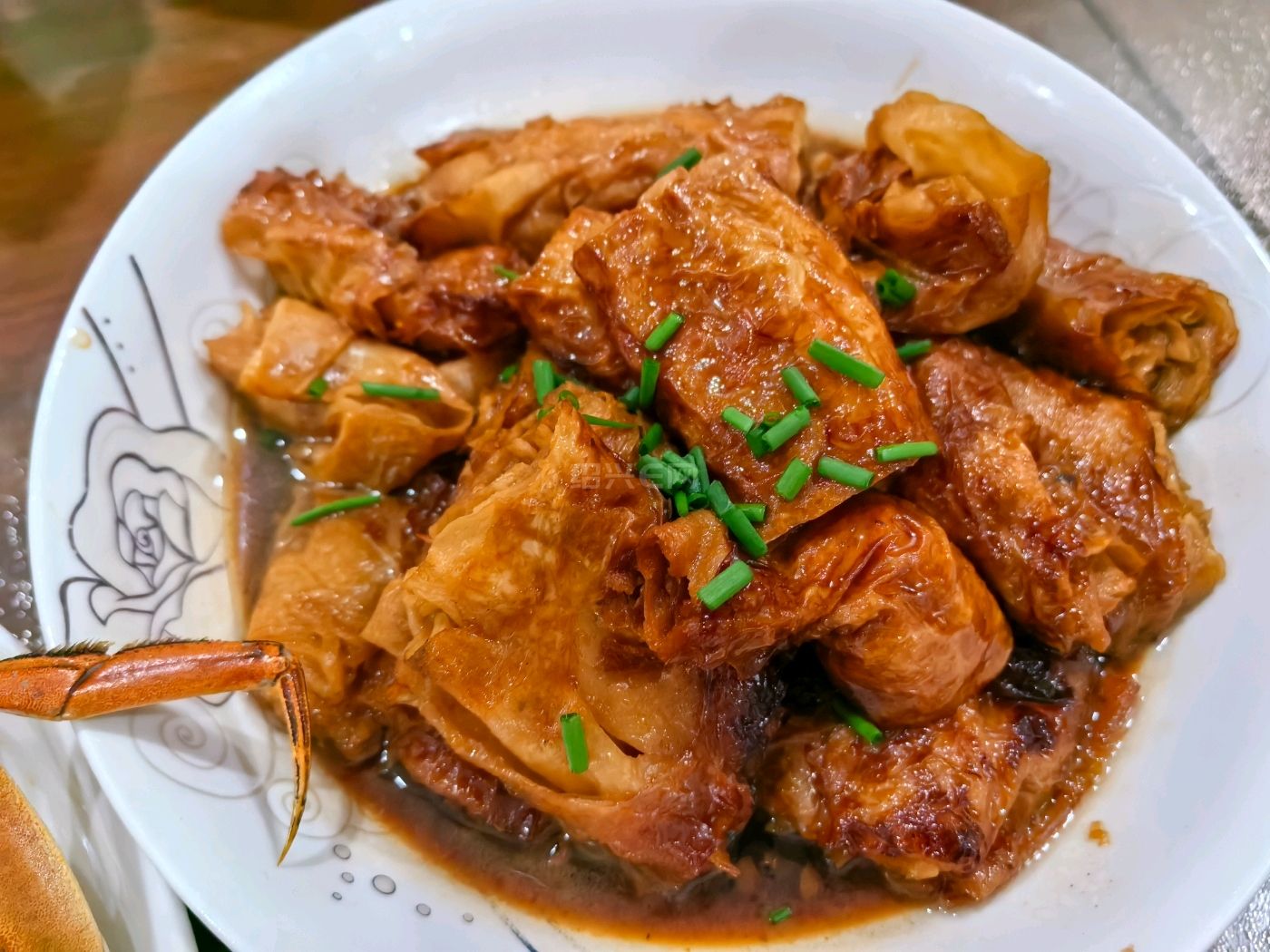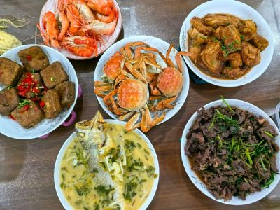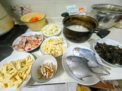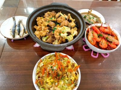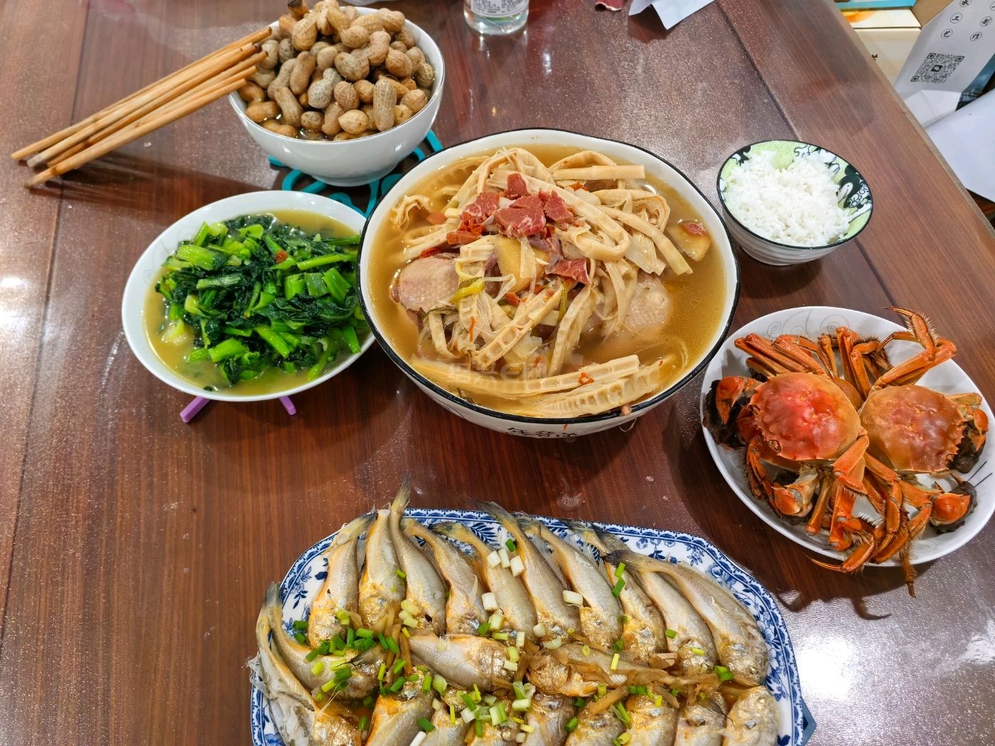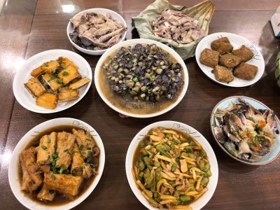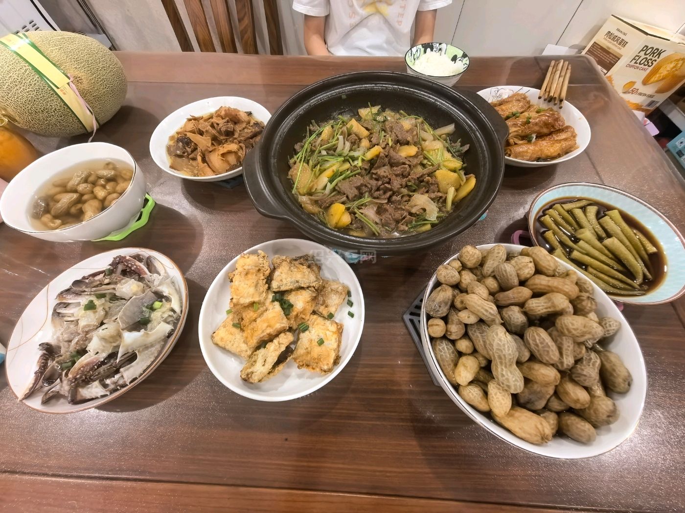 1. 牛肉+土豆片+洋葱+芹菜砂锅。量很大,一个菜也能应付一家人。2.豆腐皮卷,买回来自己再煮一下。3.炸带鱼,口味还行,卖相不行,下次再改进一下。4.蒸黄秋葵。5.笋烧肉。6.咸呛蟹,比较便宜的那种三眼蟹。7.煮花生。
