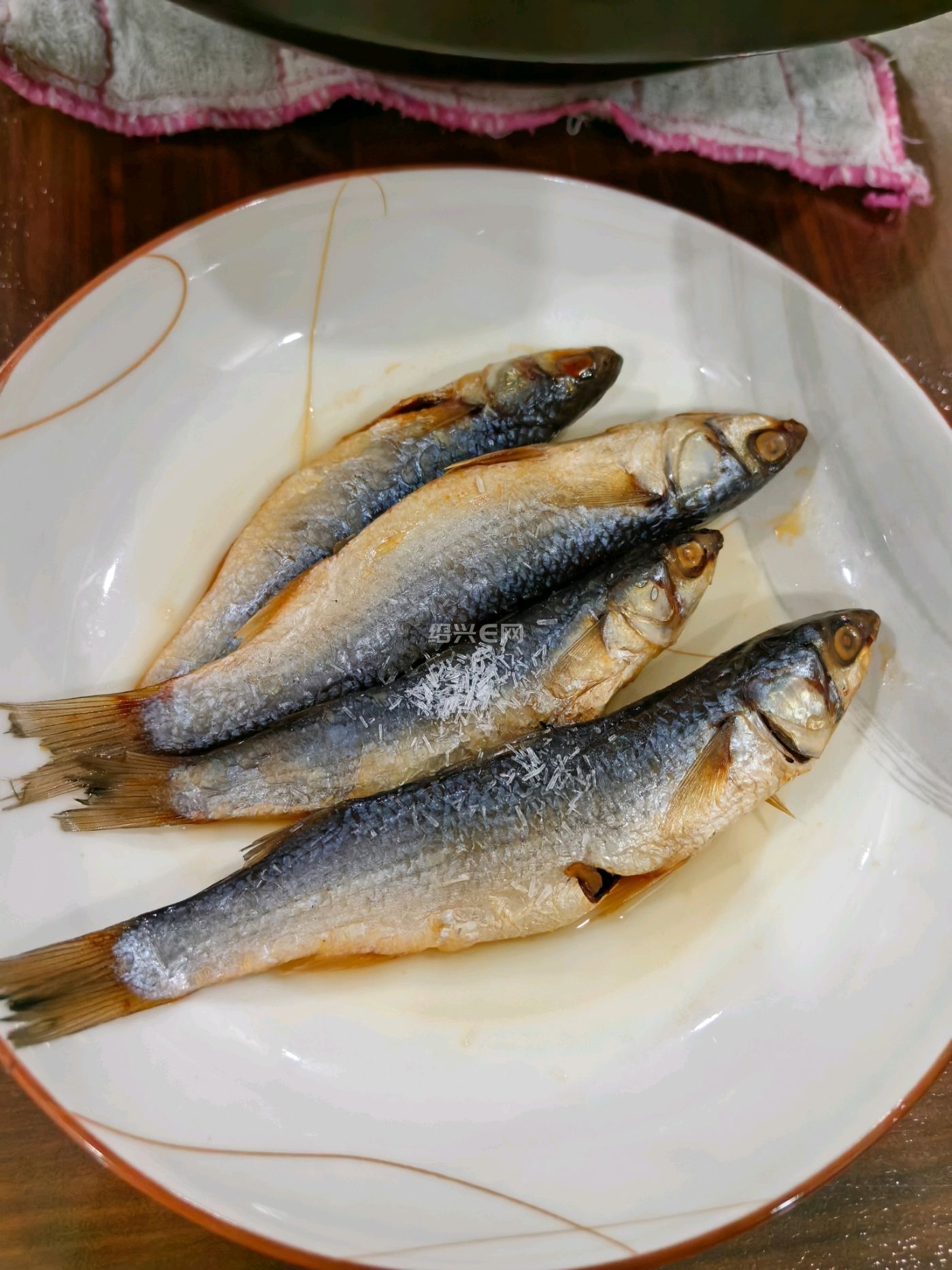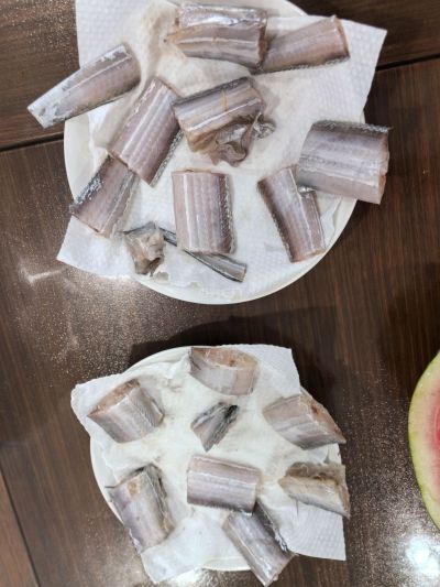 然后就是风干,不要让带鱼有水分。最后也是最重要的就是在油中炸制。在油温在180 到 200 度间初次炸制,然后捞起来,油温再稍微高一些,待油锅中没有气泡后再复炸一下即可。
