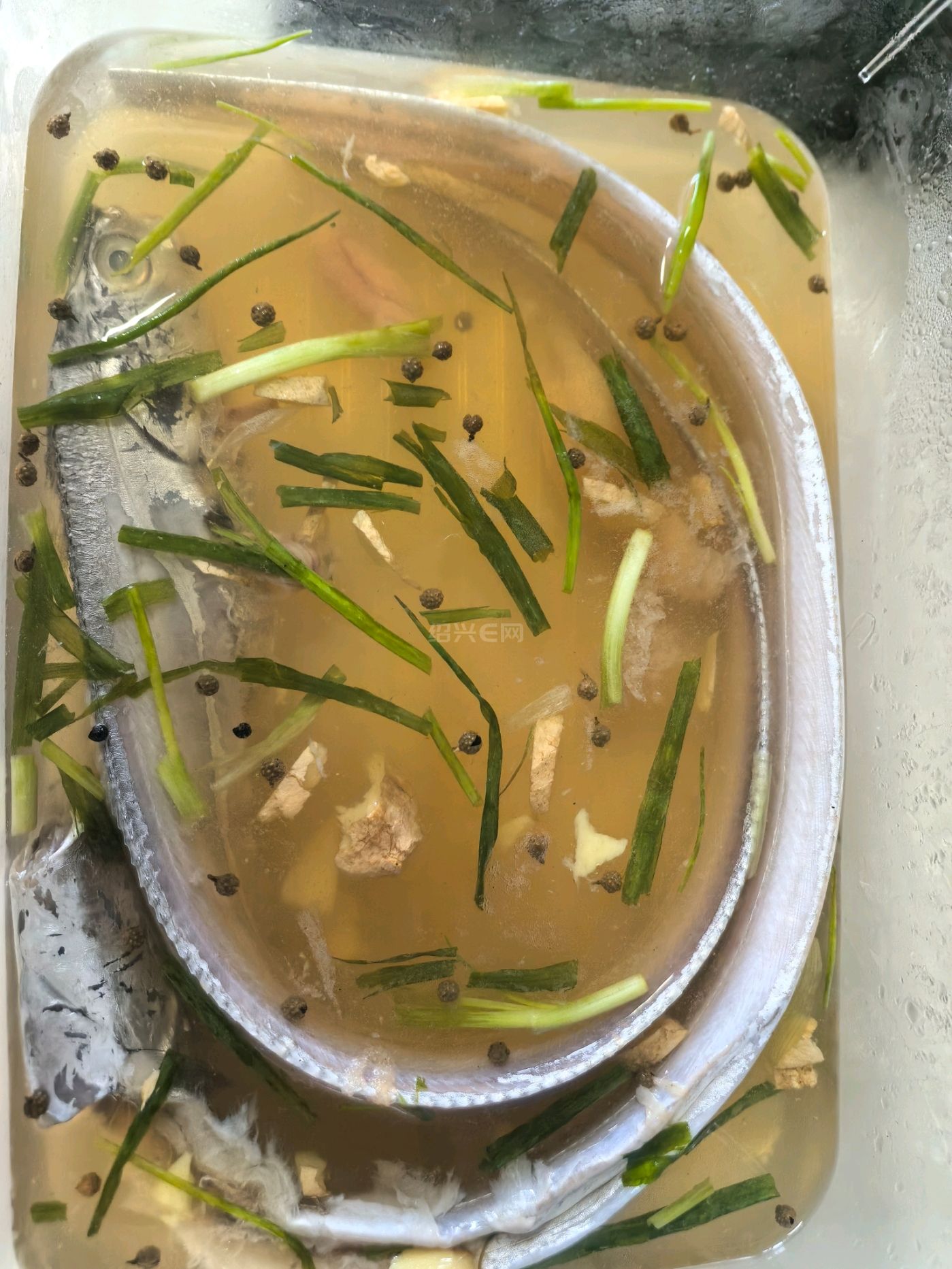 然后就是把带鱼泡在调制的料水中浸泡入味。把盒子一起放冰箱 2 小时左右。料水调制,放入盐,味精,黄酒,花椒,小葱揉碎出汁,生椒拍碎出汁。具体比例自己调配,盐不要太多就行。