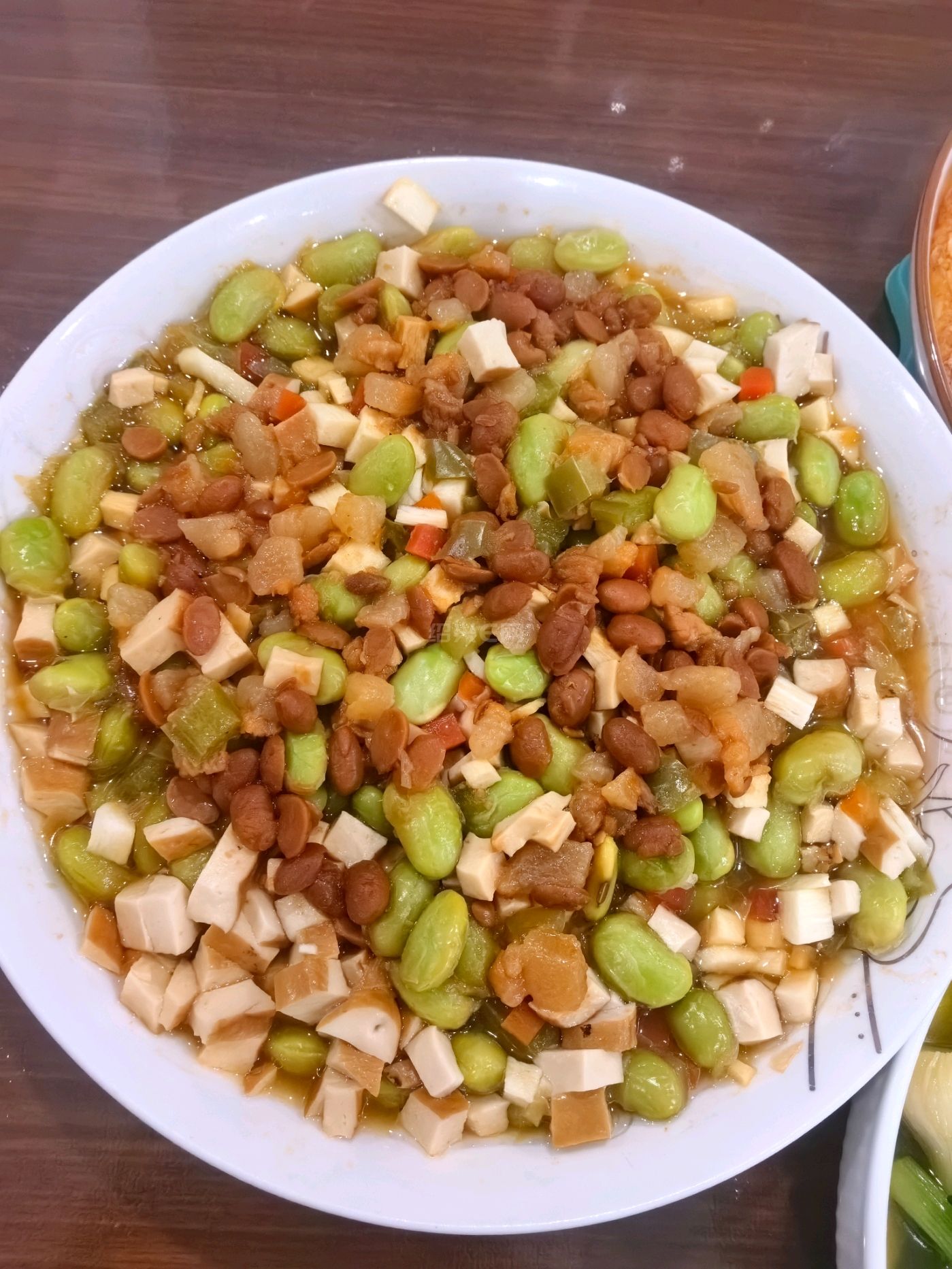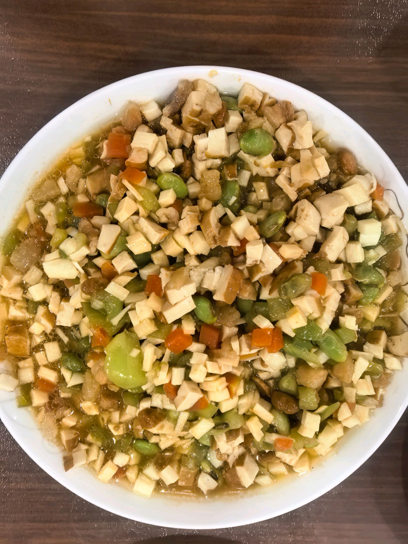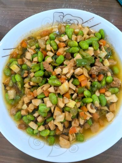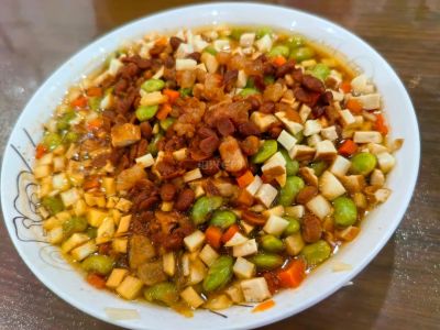 10 月 13 日早餐,酱蒸三丁。前一天晚上先用肥肉丁和黄豆酱炒一炒,然后放冰箱,第二天放在三丁上面蒸一下。三丁是毛豆粒,茭白丁,胡萝卜丁。