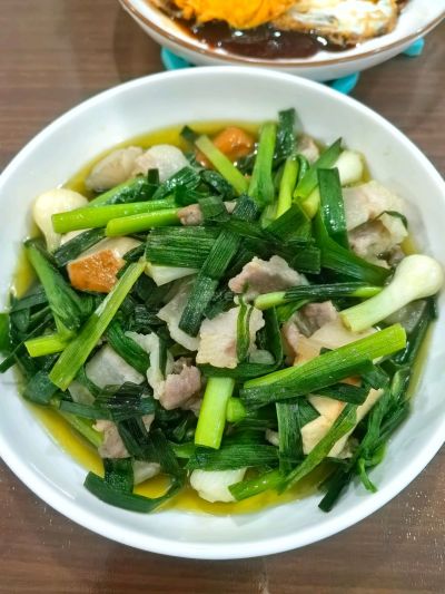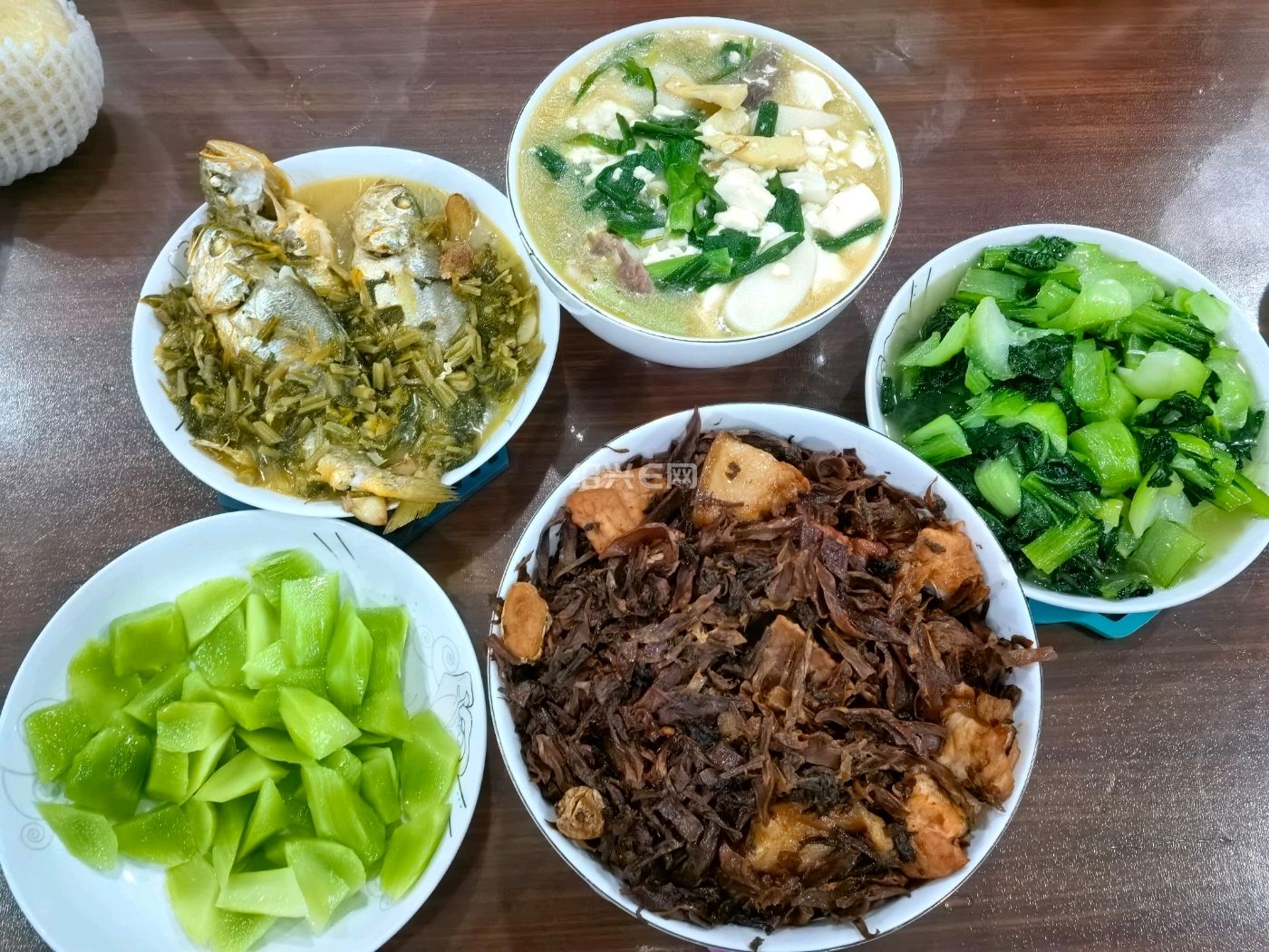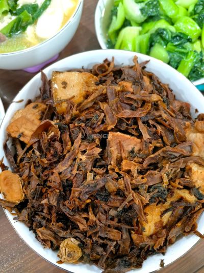 11 月 2 日晚餐,最普通的家常菜。大蒜豆腐年糕。糯叽叽的青菜。雪菜烧黄鱼。梅干菜烧肉。凉拌莴苣笋。