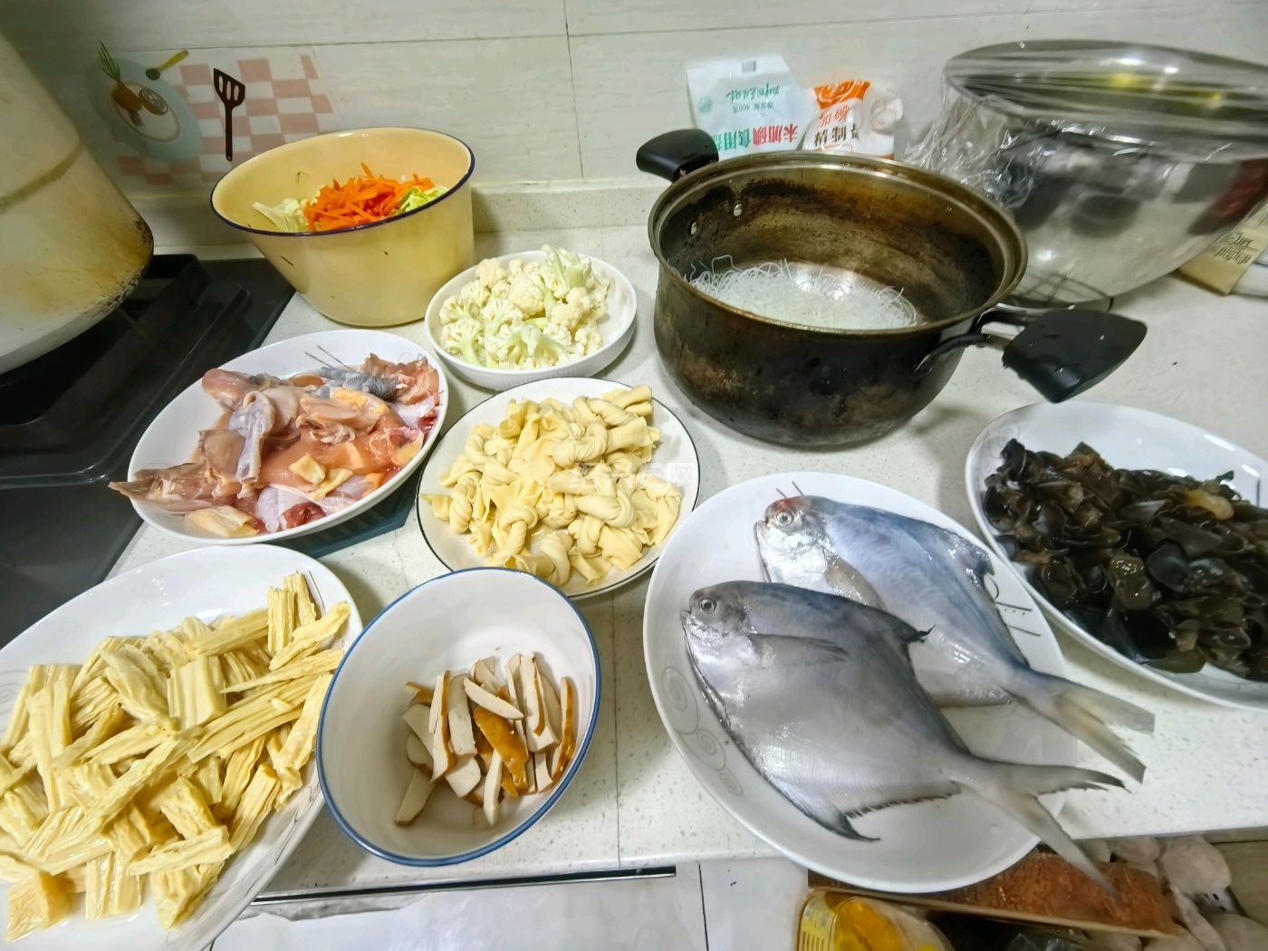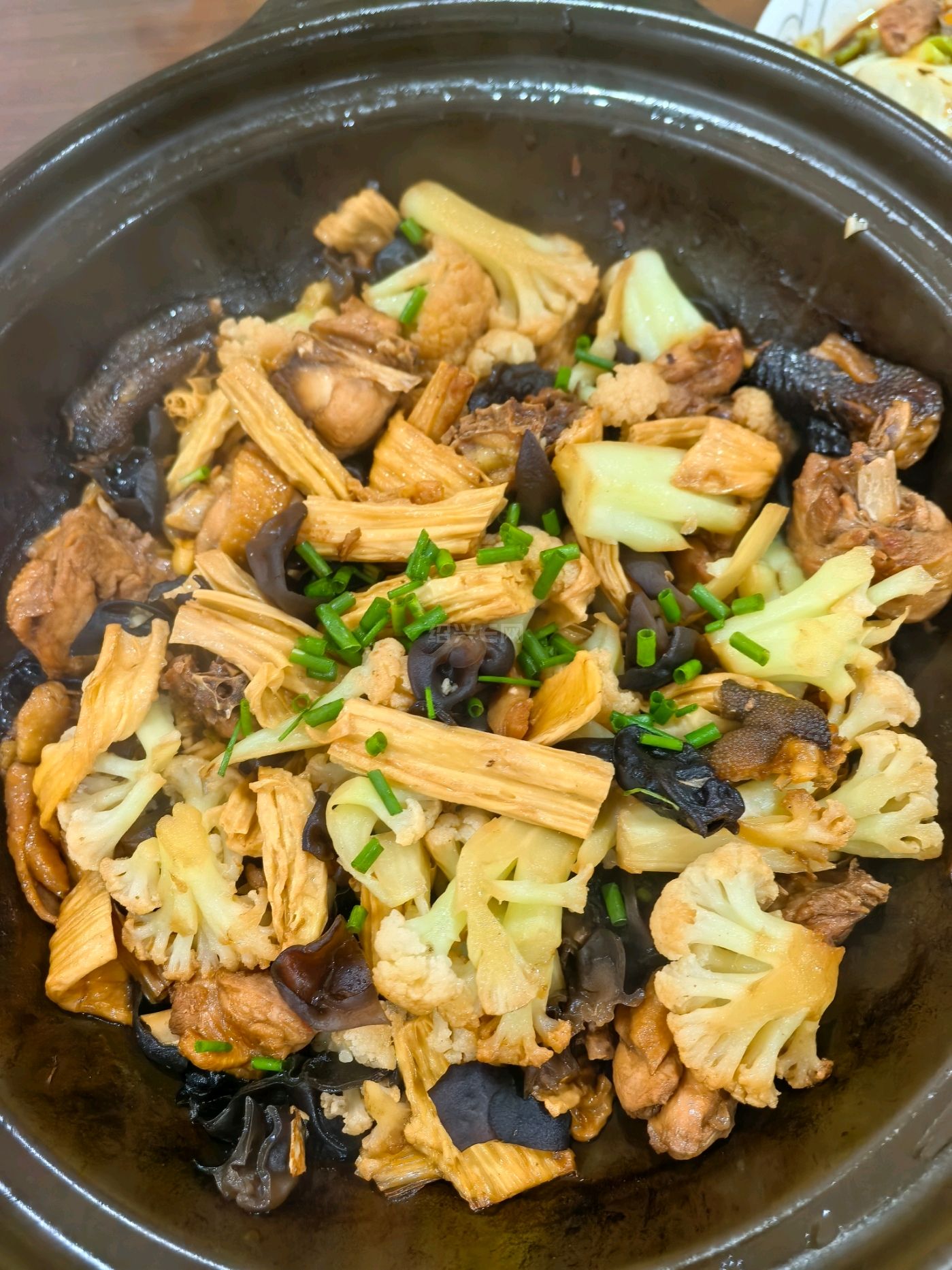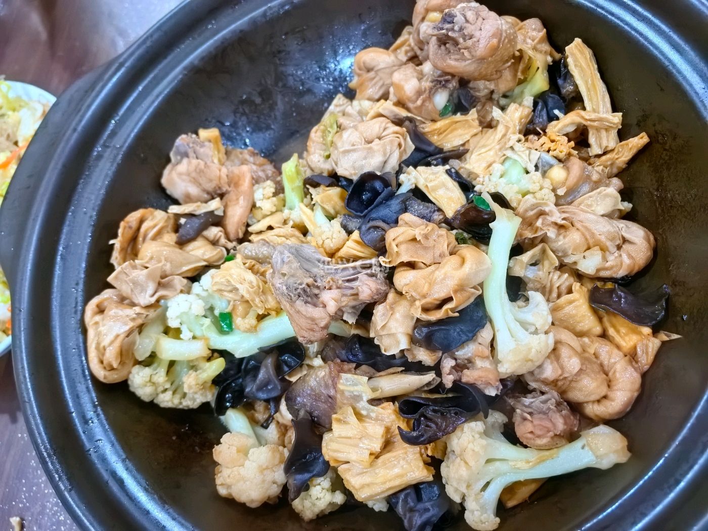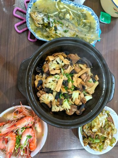 记录 2025 年 10 月 25 日的晚餐,周六加班,急急忙忙做了四个菜。腐竹鸡肉煲,还加了黑木耳、花菜。冬天适合用砂锅,做好之后保温时间长一点。口味不错,拍照效果卖相不是很好。另外是咸菜烧黄鱼,包菜炒肉片,沼虾。