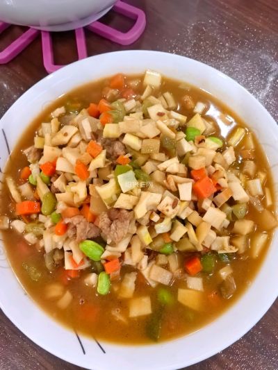 11 月 3 日早餐,炒六丁,分别是笋丁,毛豆粒,菜椒粒,胡萝卜粒,豆腐干粒,榨菜粒,再加上自己做的榨酱。梅干菜烧肉蒸一蒸,香喷喷的,能吃上几天。还有一碗南瓜红枣粥。