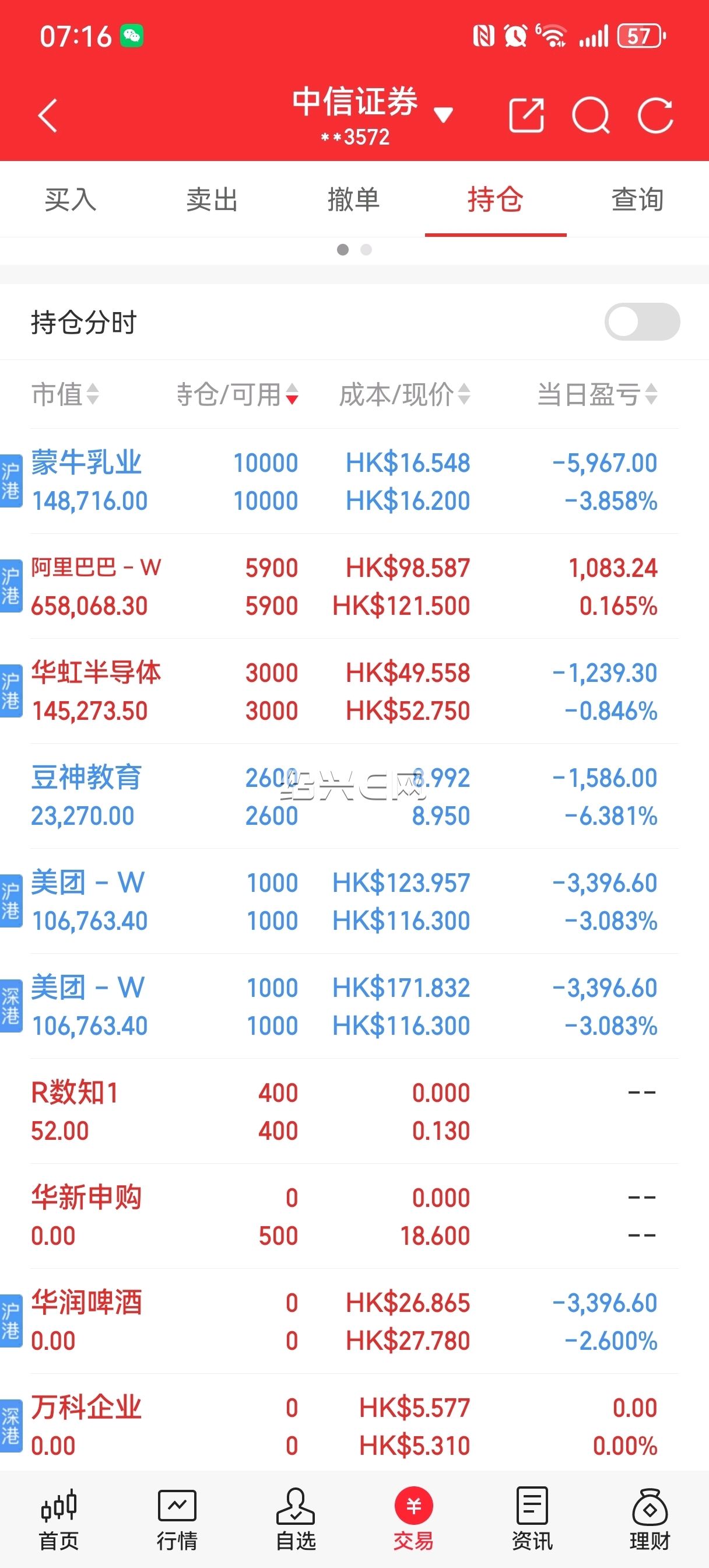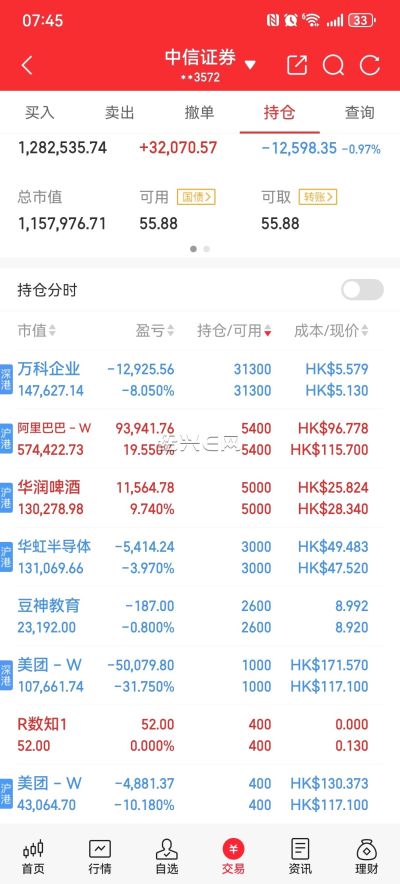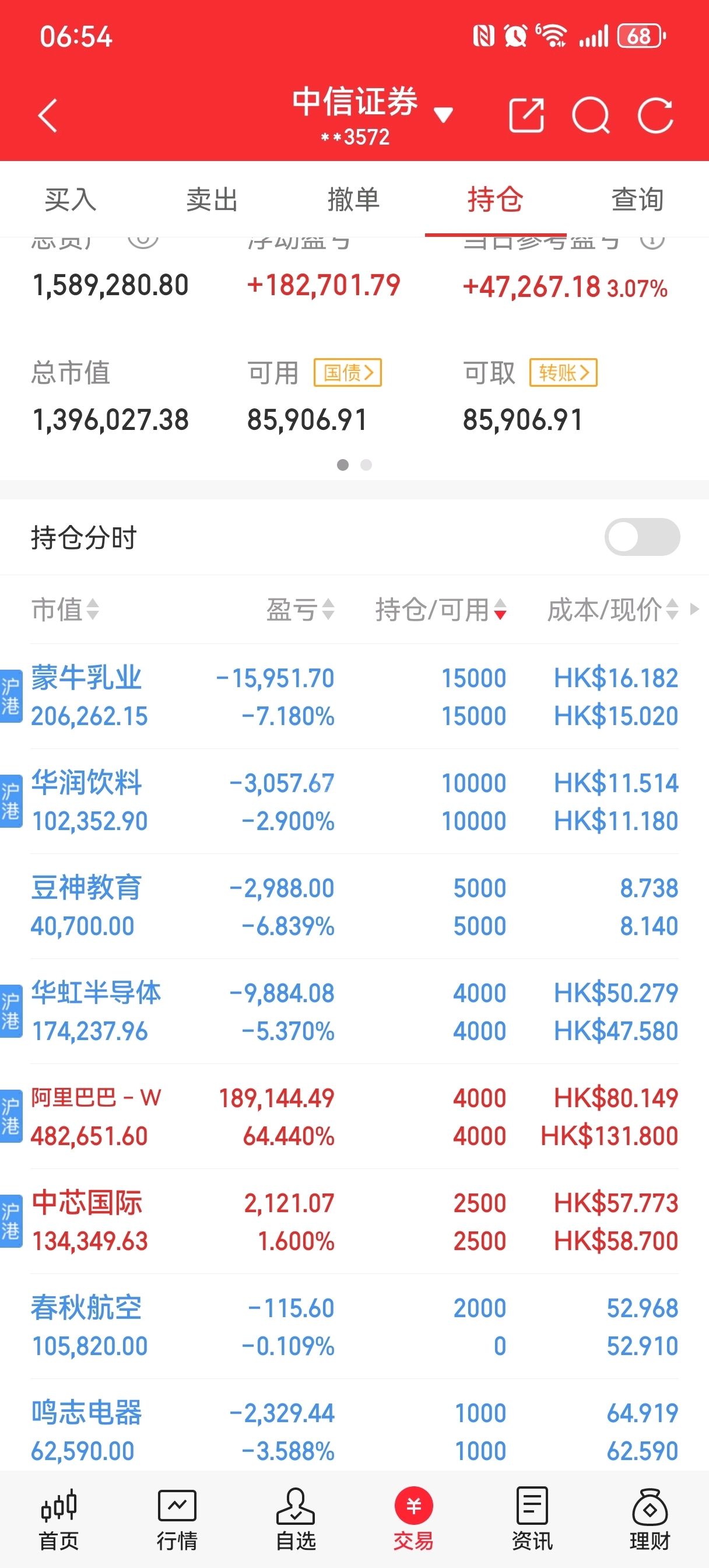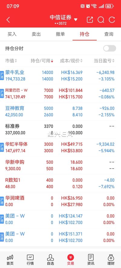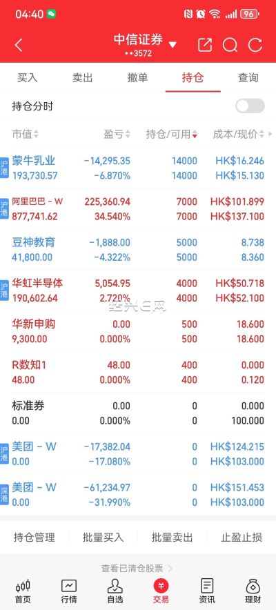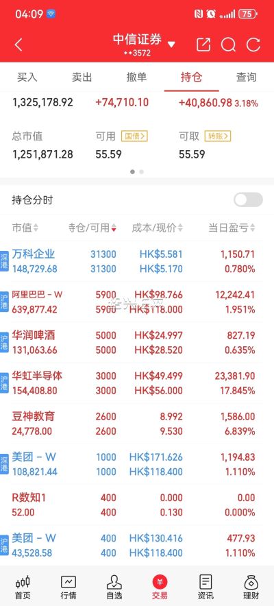 阿里巴巴终于有收获了,继续等待,美团里亏的回来了。加仓华虹半导体,大A今天涨了9以上,港股居然是跌的,明天下跌继续买。中芯国际跌了也一样。