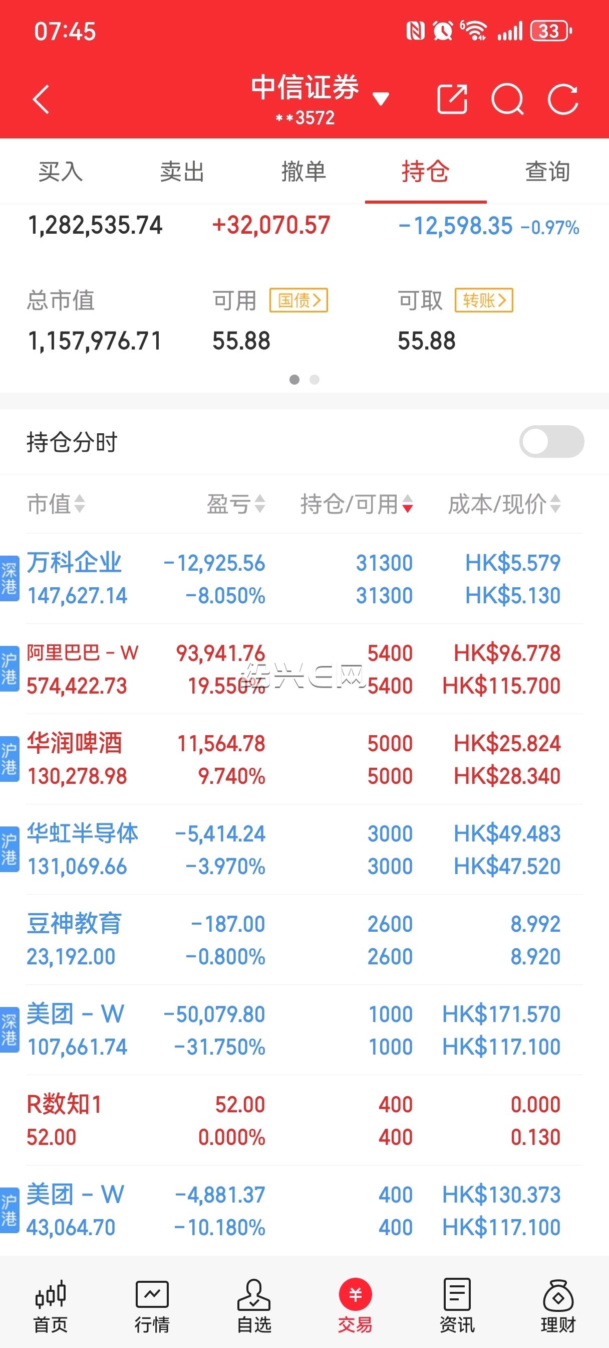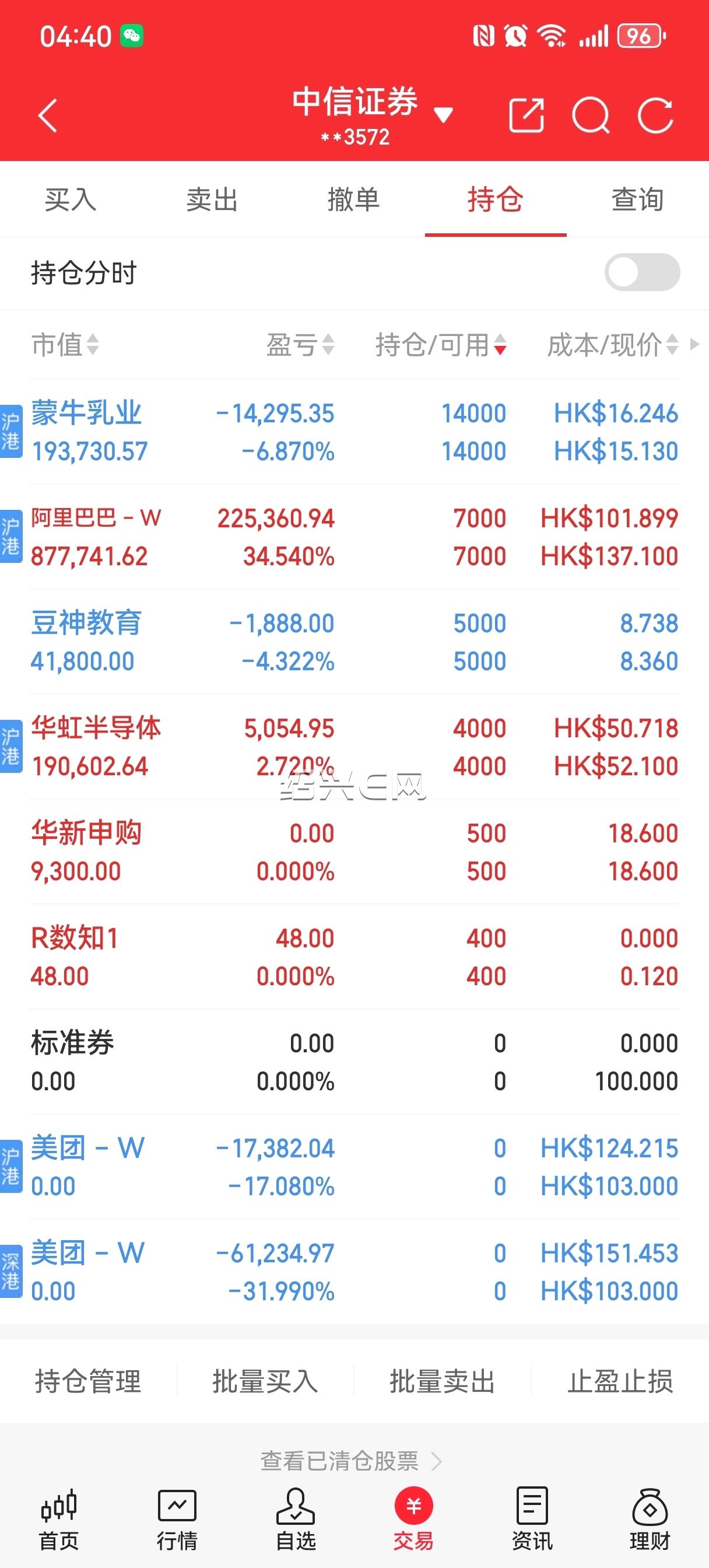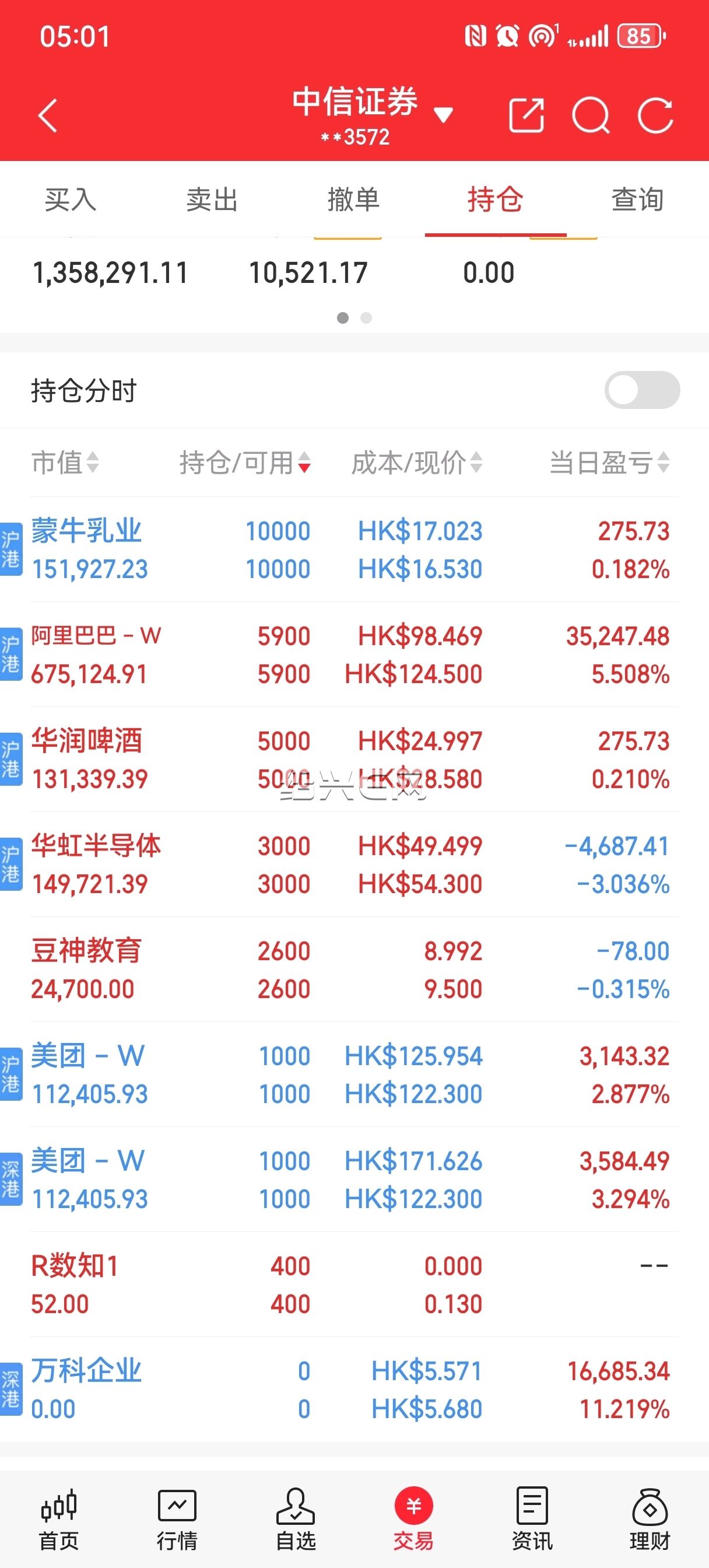阿里巴巴终于有收获了,继续等待,美团里亏的回来了。加仓华虹半导体,大A今天涨了9以上,港股居然是跌的,明天下跌继续买。中芯国际跌了也一样。