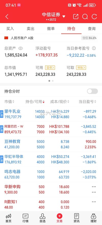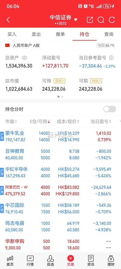 港股调仓换股没几天,今天华虹半导体直接起飞了,本来想多买点的,不过这个股1手就是1000股,真心买不多,继续加仓阿里巴巴,吃大肉考他了。大A舍不得卖,天天涨还是等等,仓位还是下个星期在降吧