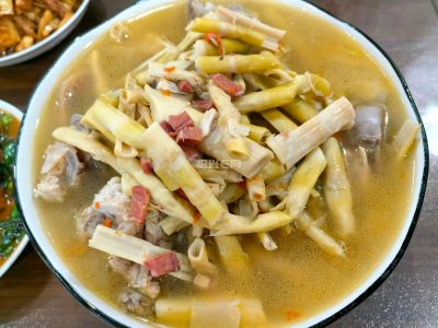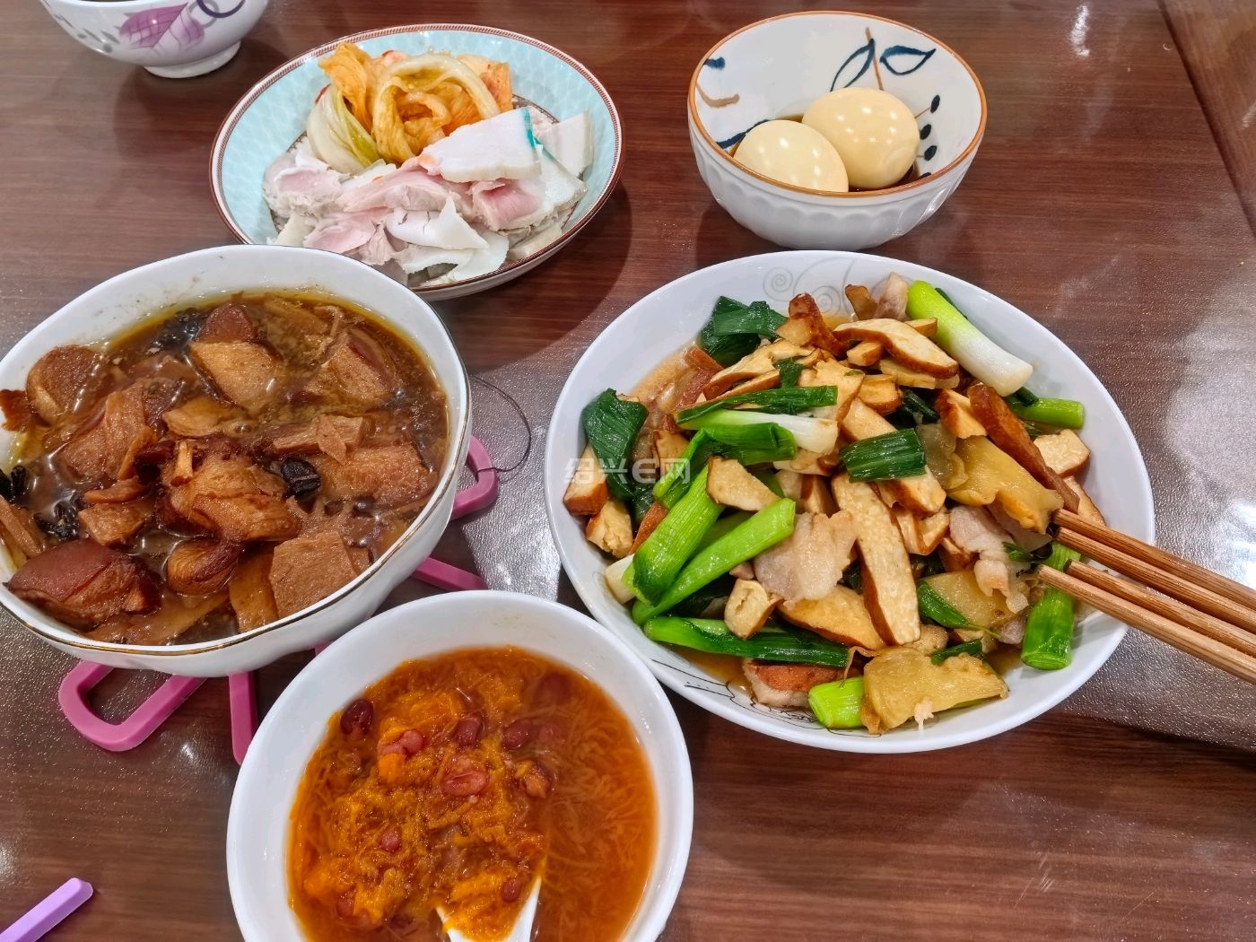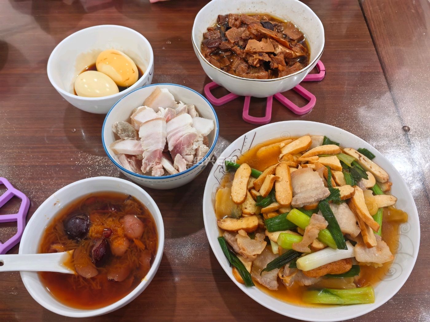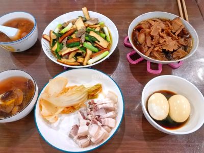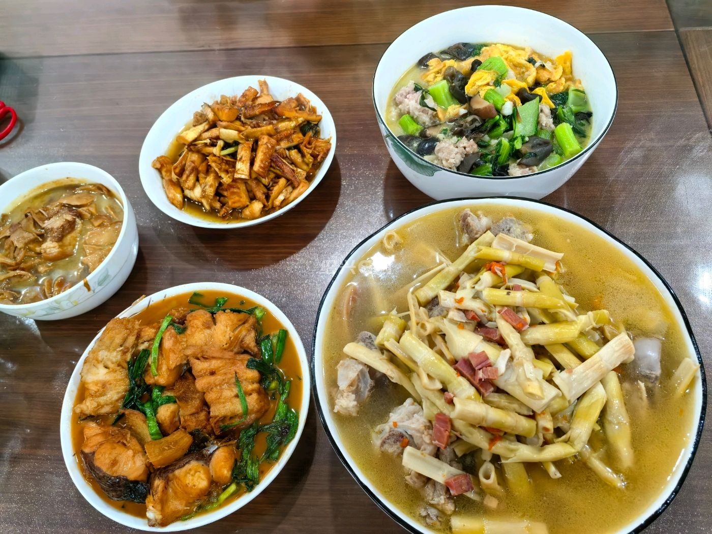 记录 2026 年 3 月 1 日休息天晚餐,咸笋炖筒骨,蛋皮肉丸青菜汤,红烧鱼块,油焖笋。肉丸加了马蹄,有点碎。