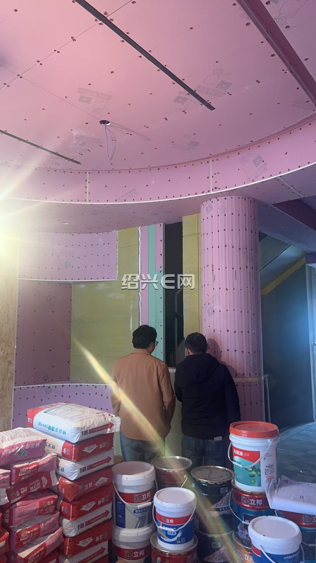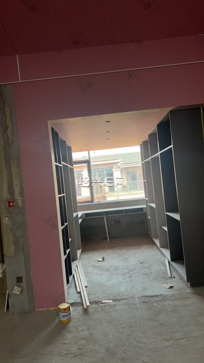 花园水电还没做完、水电 师傅继续做,屋里油漆师傅在批老粉