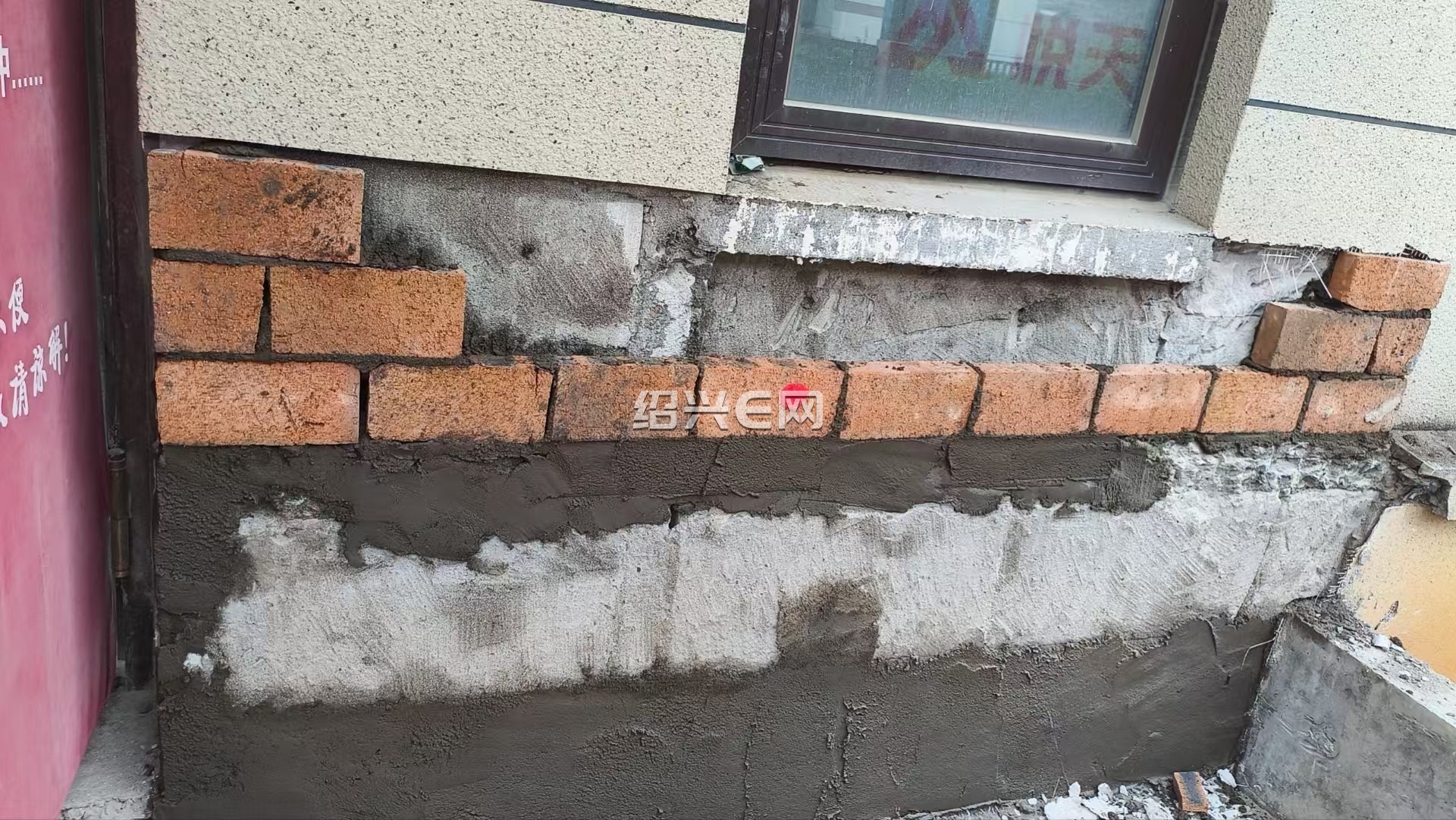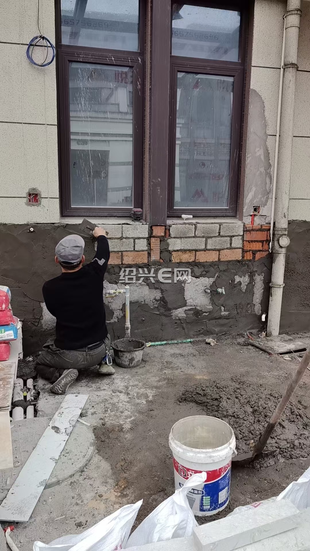这二天油漆泥工同时做,泥工砌外墙、油漆师傅仍在刮老粉