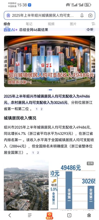 2025年上半年绍兴城镇居民人均可支配收入在全国排名第一,农村居民人均可支配收入全国排第二,你可以查一下哦。