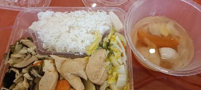 然后就随着人群,来到一个大厅里,领了盒饭。斋饭全是素食,口味还不错