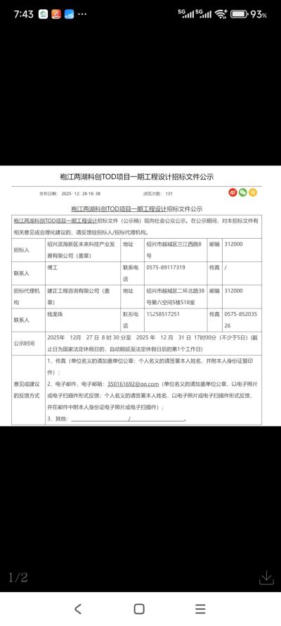 12月26日,绍兴越城区人民政府网站发布了袍江两湖科创TOD项目一期工程设计招标文件公示。
