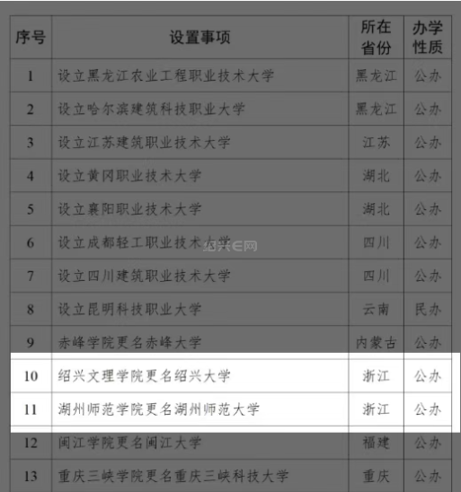其中,浙江2所高校出现在名单内:绍兴文理学院更名绍兴大学,湖州师范学院更名湖州师范大学。