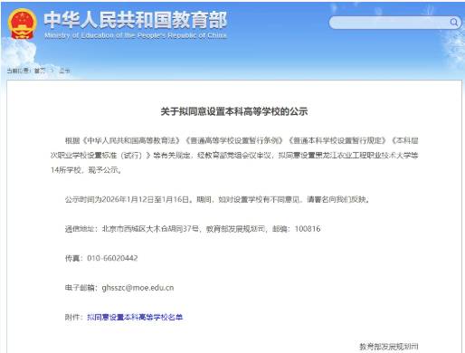 1月12日,教育部官网发布《关于拟同意设置本科高等学校的公示》。