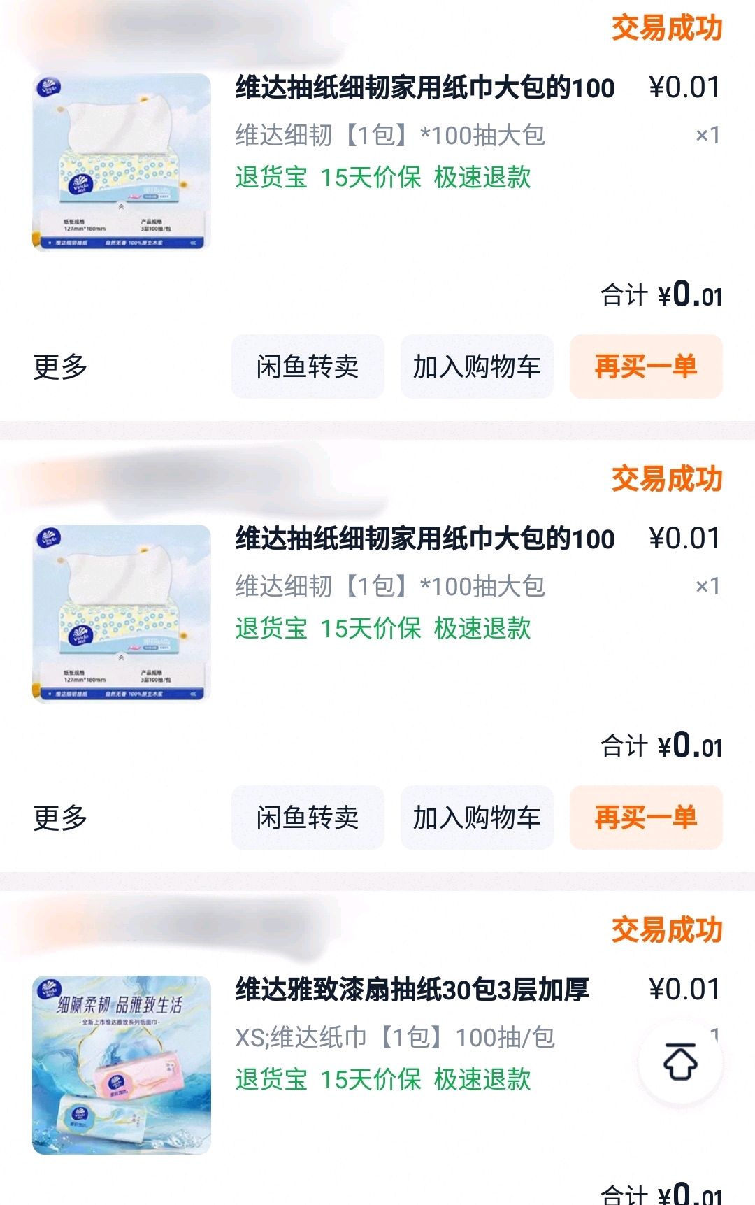 :有时候淘宝上这些一元两元三元的红包不要嫌弃,完全可以用来买纸巾,保鲜膜之类的日用品,这钱不就省下了嘛。超市买买一包两块三块,我这个就一分钱。[图片](2025-12-12 10:56)