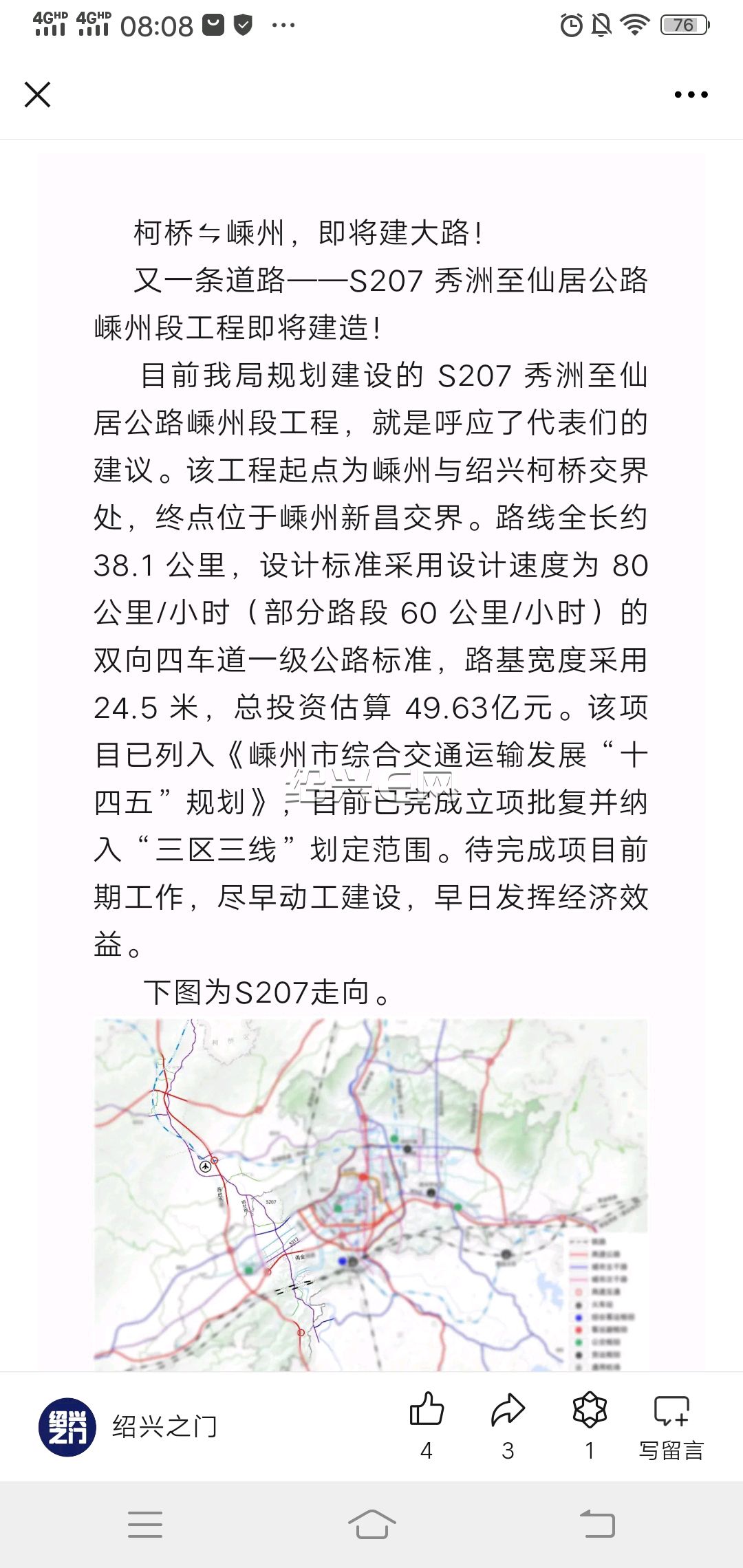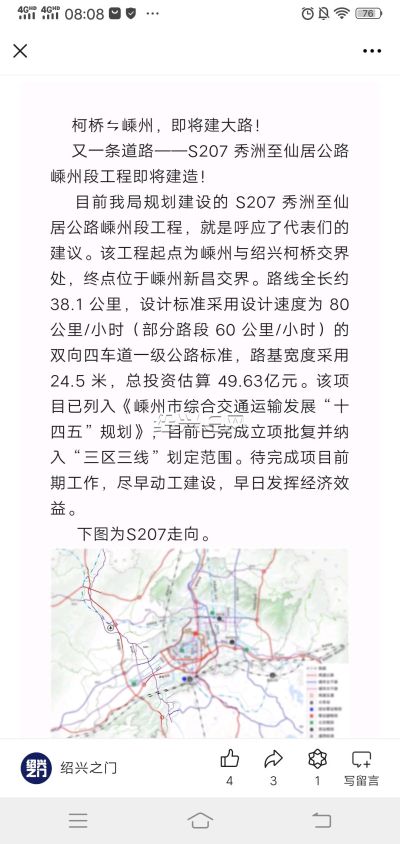 看图,绍兴将新建一条柯桥到嵊州新昌的省道公路S207,全长38.1公里,设计时速80公里,双向四车道一级公路标准,路基宽度24.5米,总投资49.63亿元,这条S207省道公路建成,嵊州新昌不但多了一条通道到绍兴城区,而且嵊州新昌往柯桥、越城之间即将会启动市域公交时代(这样一来,嵊州新昌就会有一二条绍兴地铁的接驳公交车,特别是到芳泉地铁站公交站场)。虽然这条不是国道,但是嵊州新昌到柯桥、越城主城区会缩短不少时间,之前去绍兴主城区都是经过104国道上虞、越城、柯桥。