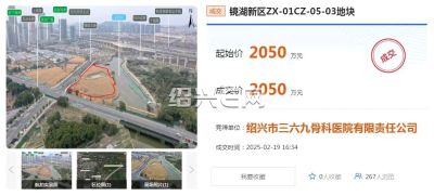 2月18日,镜湖新区ZX-01CZ-05-03地块成功出让,由绍兴市三六九骨科医院有限责任公司拍得该地块。