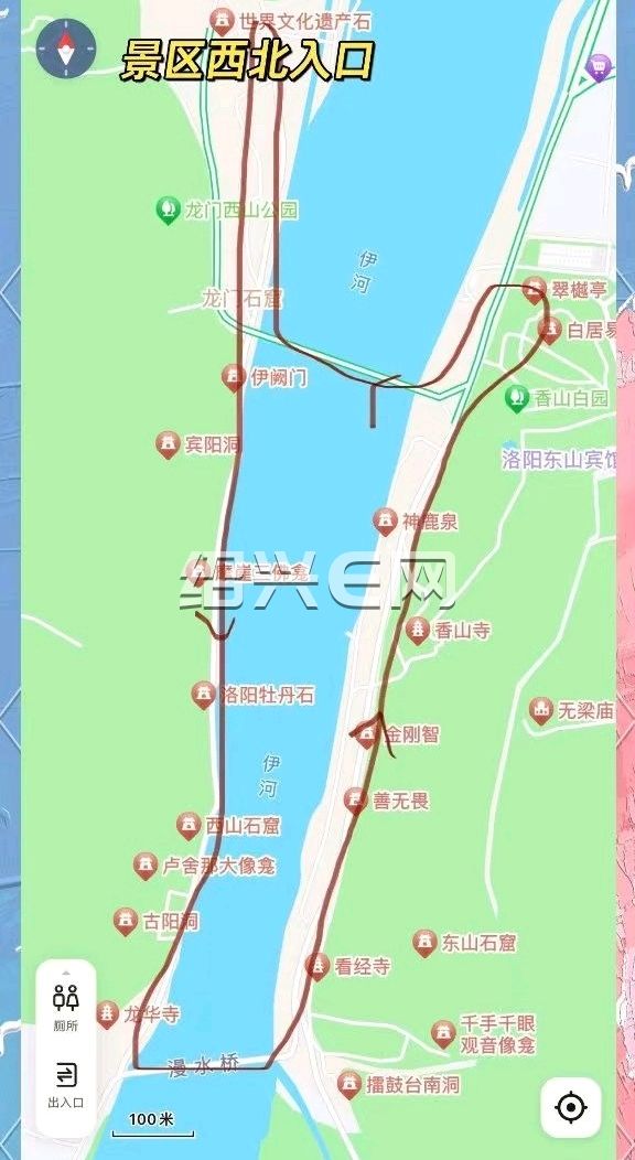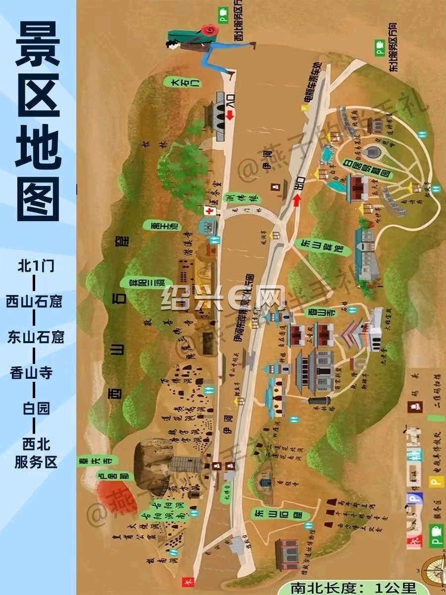 《龙门石窟》景区的游览路线是:从西山龙门进入~由北向南游览西山景区~再从南门出口出~过桥到对面东山景区~径直由南到北到卢舍那大佛观景台~再坐观光車回程到景点服务区门口;如单程游览的话,路途大约在2公里左右。
