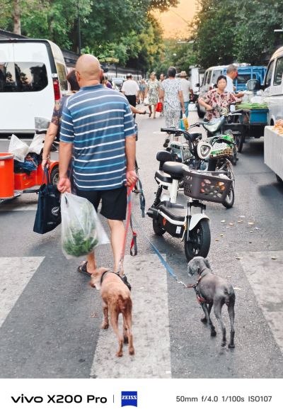 一老者上街还牵两只狗