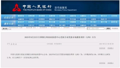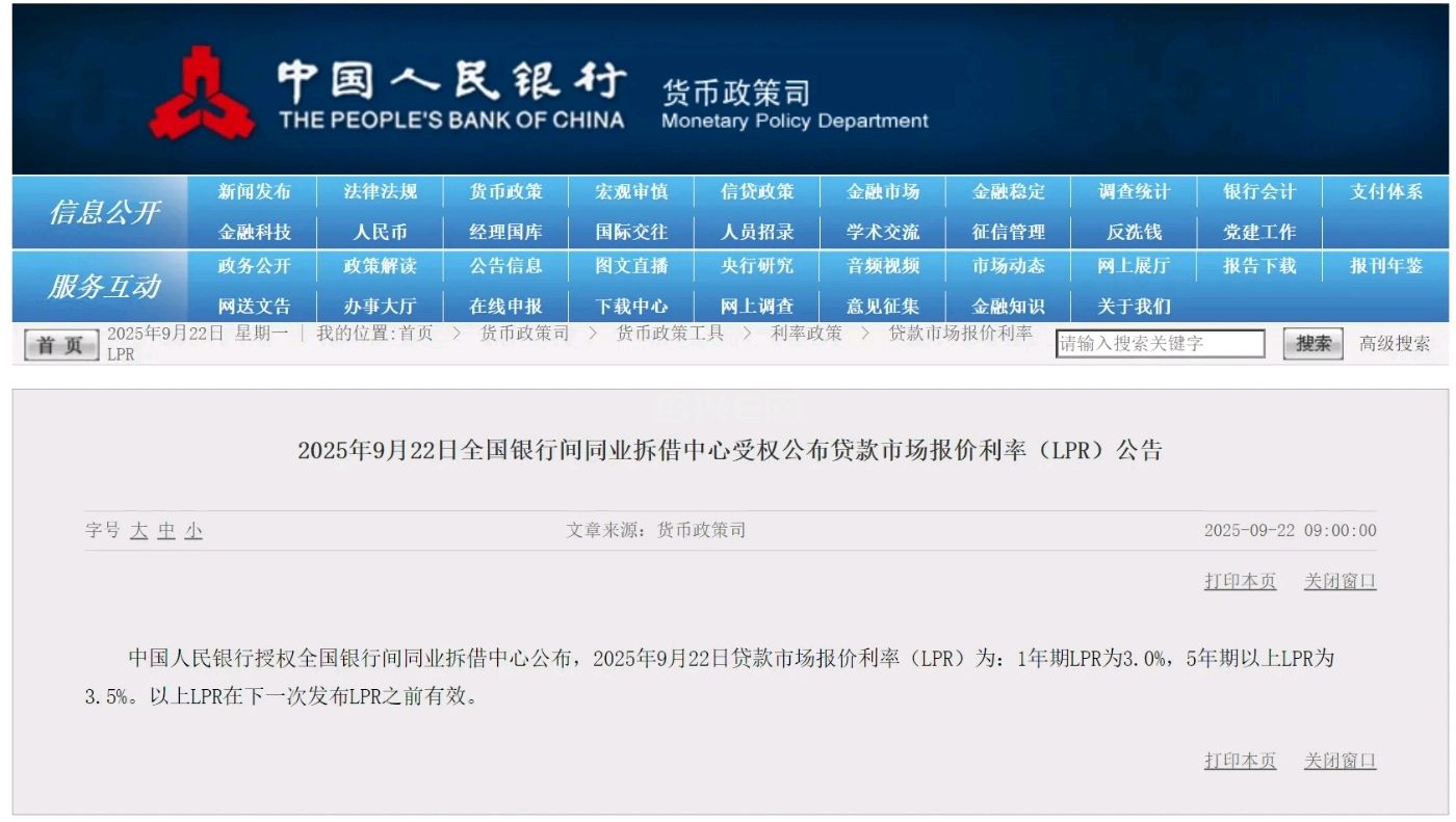 9月22日,中国人民银行授权全国银行间同业拆借中心公布,2025年9月22日贷款市场报价利率(LPR)为:1年期LPR为3.0%,5年期以上LPR为3.5%。以上LPR在下一次发布LPR之前有效。