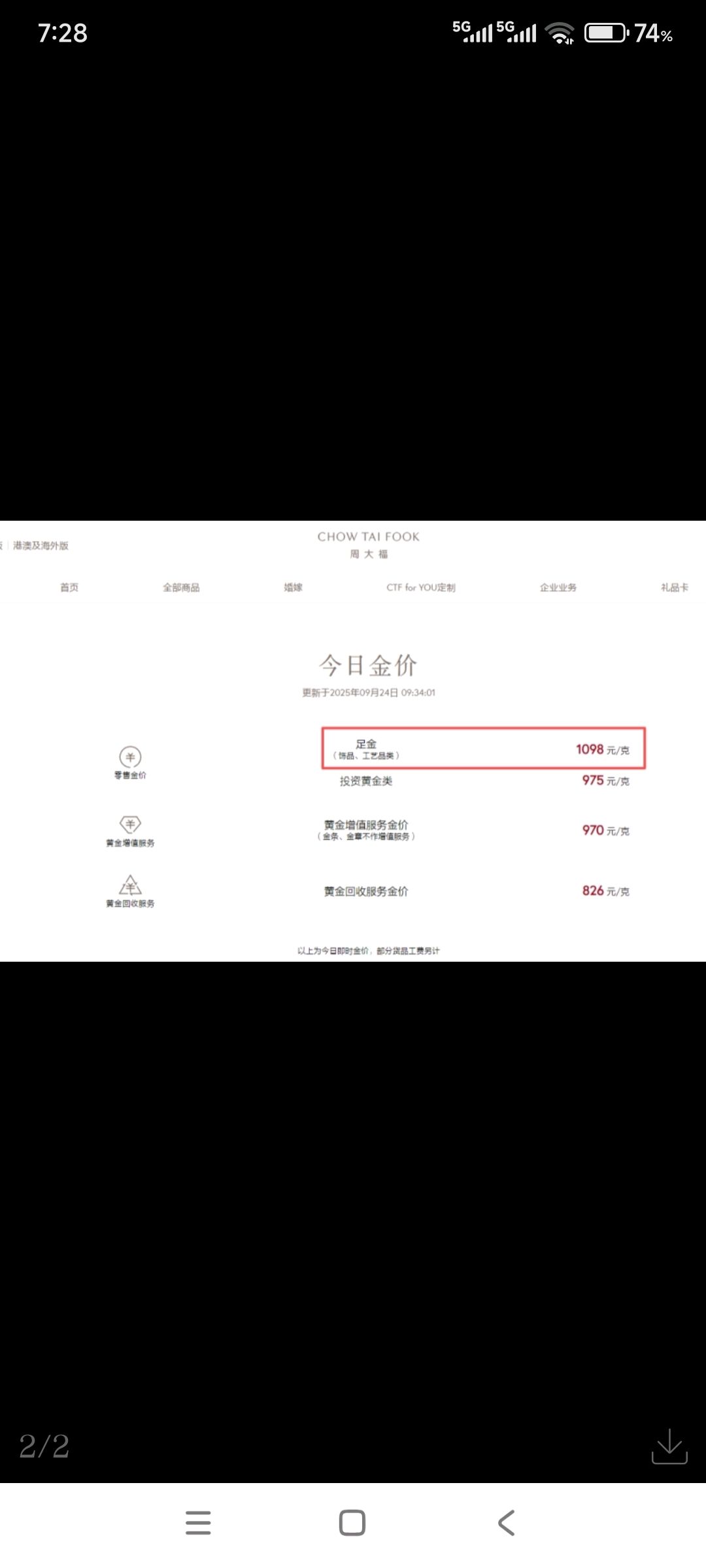另一家知名黄金珠宝品牌周大福官网数据显示,9月24日其足金(饰品、工艺品类)价格也已逼近1100元/克,为1098元/克。