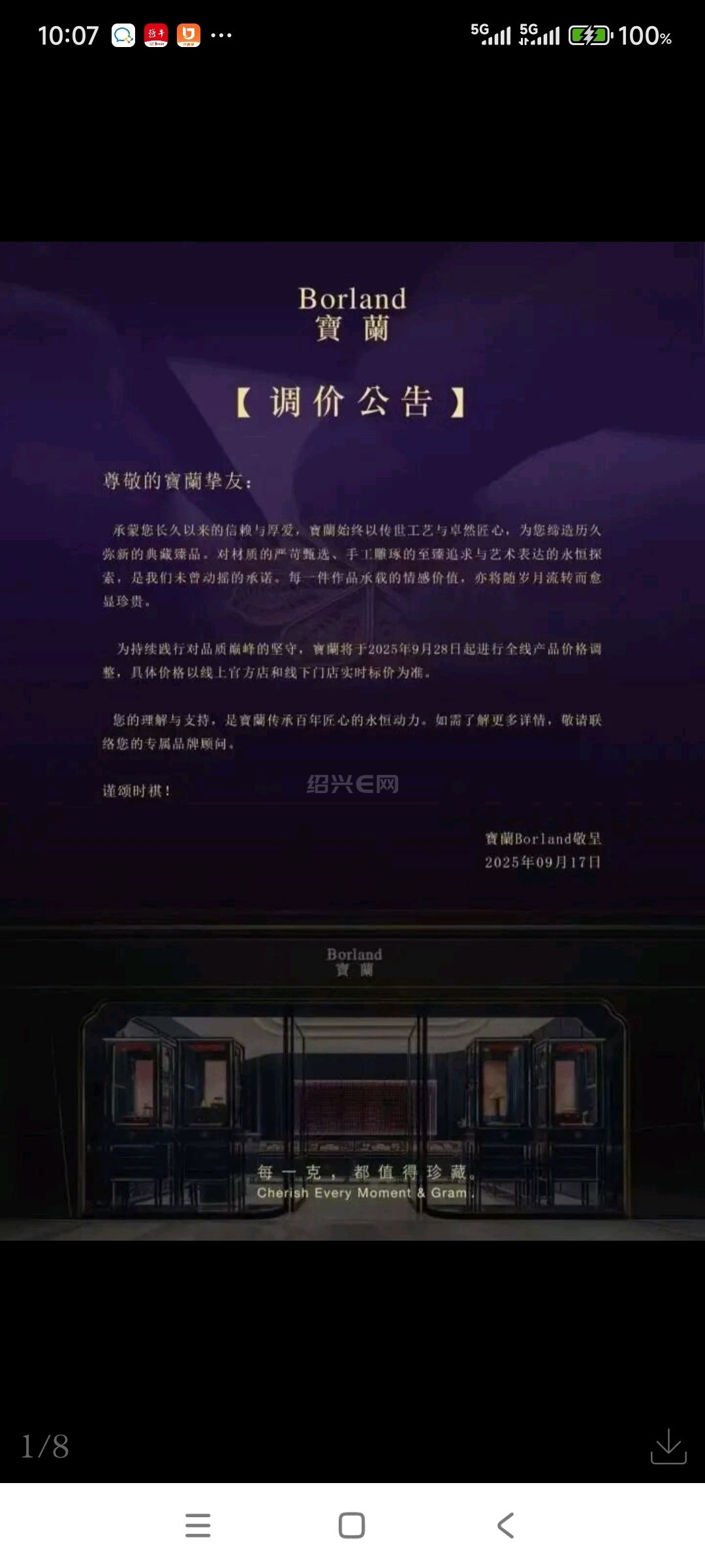 这是宝兰年内的第二次调价。今年4月,国际金价飞涨,宝兰也调过一次,当时涨幅在5%-15%。根据店员预测,这次的调价幅度在15%以上。