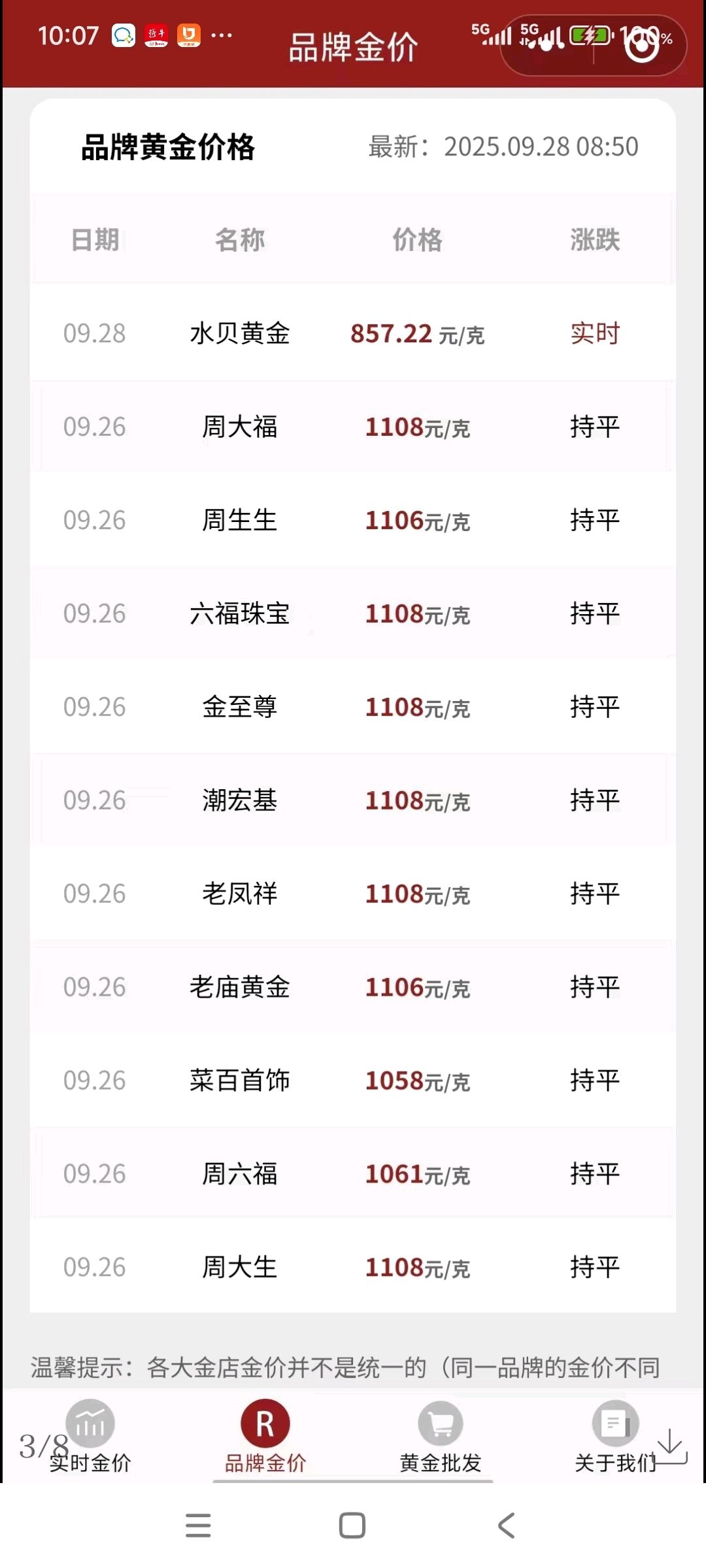 根据今天的最新报价,周大福、周大生、老凤祥、潮宏基、六福珠宝等多个品牌足金报价均是1108元/克。