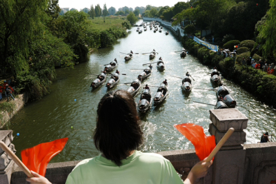 国庆节来临之际,东湖景区以“千年运河 乌篷竞渡”为主题,策划推出“2025第二届绍兴乌篷船马拉松邀请赛”,展现运河文化源远流长,乌篷船非遗技艺薪火相传,水上旅游蓬勃发展的盛况。
