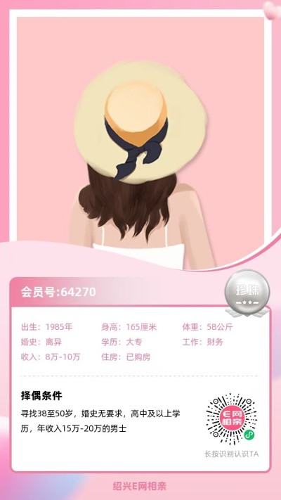 一、实名认证会员,证件齐全,身份明确,可联系工作人员升级VIP会员,参与红娘个对个私下介绍或者直接安排见面,可报名参与相亲基地的各种大小型专场相亲会,以及种类繁多的相亲活动;
