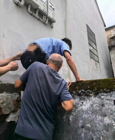 民警见状立刻绕道后院,发现围墙不高,在众人的帮助下,他翻墙而入。