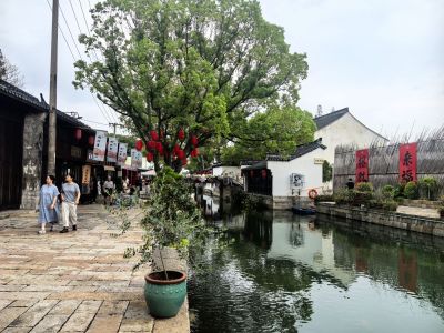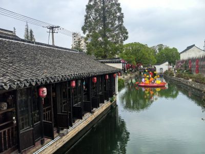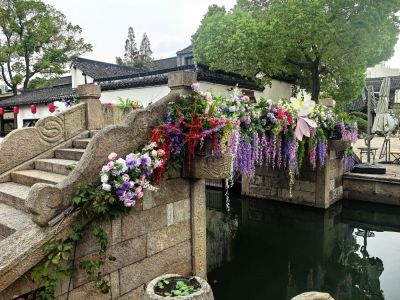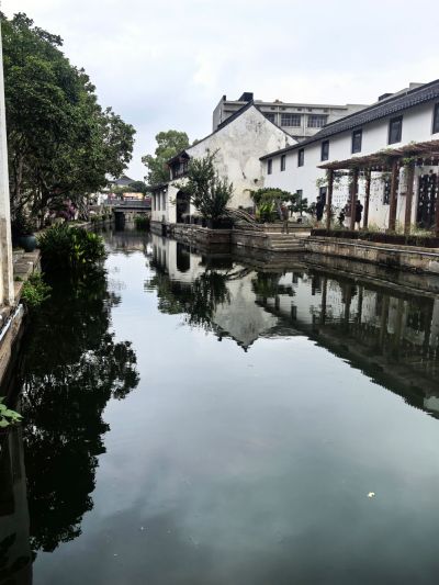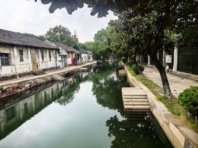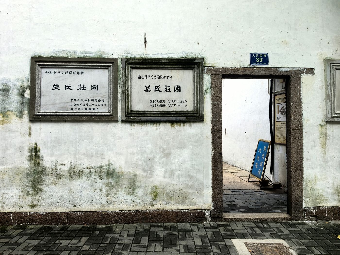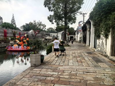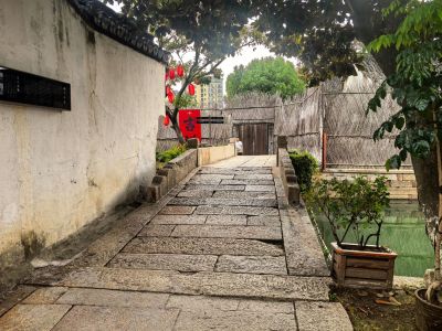 位于莫氏庄园大门口,河道二,三倍宽于绍兴的府河,河踏步布置与绍兴的不同,石板路上的石板为长条形横铺与绍兴大块的青石板又是不同。