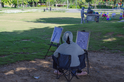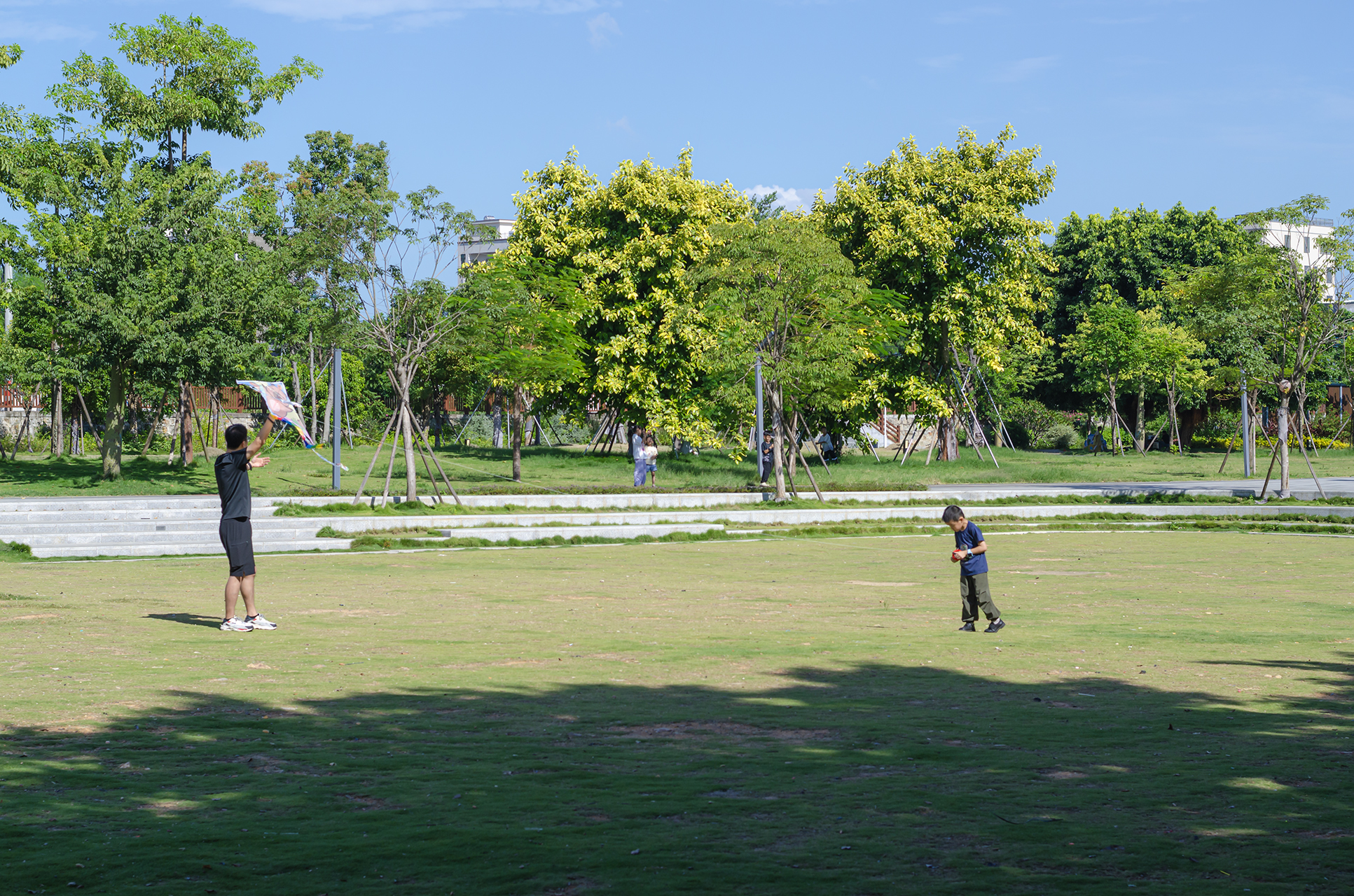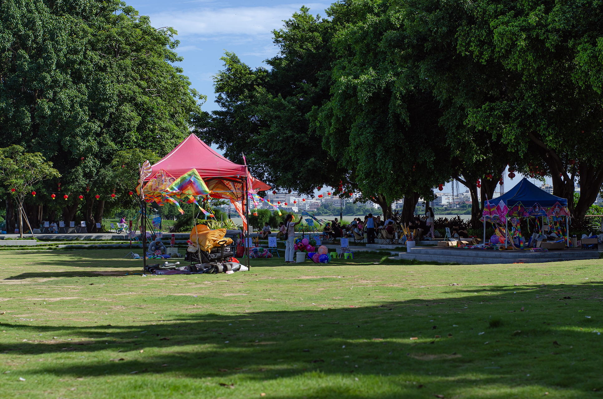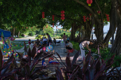 烈日下,有人陪儿子放风筝,有人躲树荫下喝茶聊天。