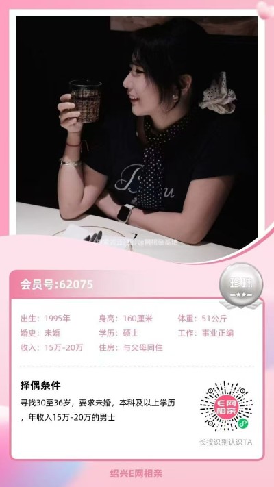 寻觅:36岁以下,身高170+,大专以上,外貌顺眼,房车俱备,开朗稳重的绍兴本地男生。