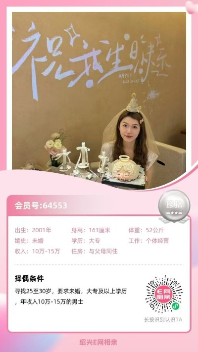 01年越城小姐姐,身高163,时尚美丽又气质。个体经营,年薪10-15万,有车。
