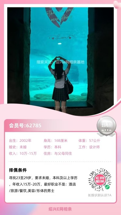 独生女,设计师,年薪15-20万,有房有车。父母经商,有退休金和医保。
