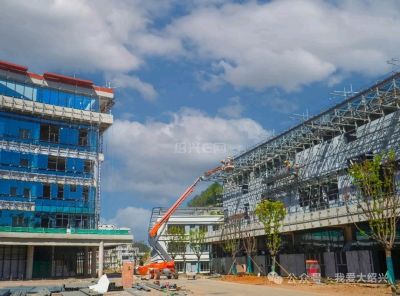 近日,记者走进浙工院新昌学院项目现场,首先被此起彼伏的作业声包围。不同于此前主体施工阶段的“大场面”,如今的工地更添了几分“精细感”。在三期教学楼的一层大厅,两名工人正踩着脚手架,小心翼翼地调整吊顶吊杆的间距,确保每一根都精准对齐;室外场地中,几台挖掘机配合着工人,将景观绿化的基础土壤平整到位,为后续栽种植被做准备。“目前整个项目的总体形象进度已经完成75%,一期、二期、三期的二次结构施工全都收尾了。” 中铁十一局集团有限公司项目总工沙胜楠带着记者穿梭在工地中,指着已完工的一期、二期生活区介绍,“这边的宿舍楼,门窗都已安装完毕,内部的卫生间防水、墙面涂料也都做好了,完全具备交付条件。三期这边现在重点推进装修,整体进度约20%,楼内的管线排布、墙面找平正在同步开展。我们也会根据季节特点调整工序,比如冬季重点推进室内装修,避免低温影响施工质量,确保项目按计划推进。”