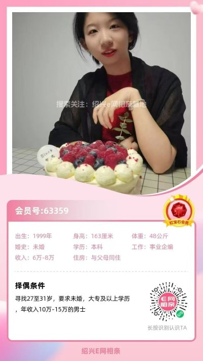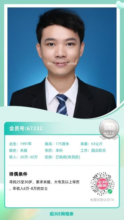 原籍福建,定居绍兴。211本科毕业,国企职员,年薪20~30万,婚房买在镜湖,有车。