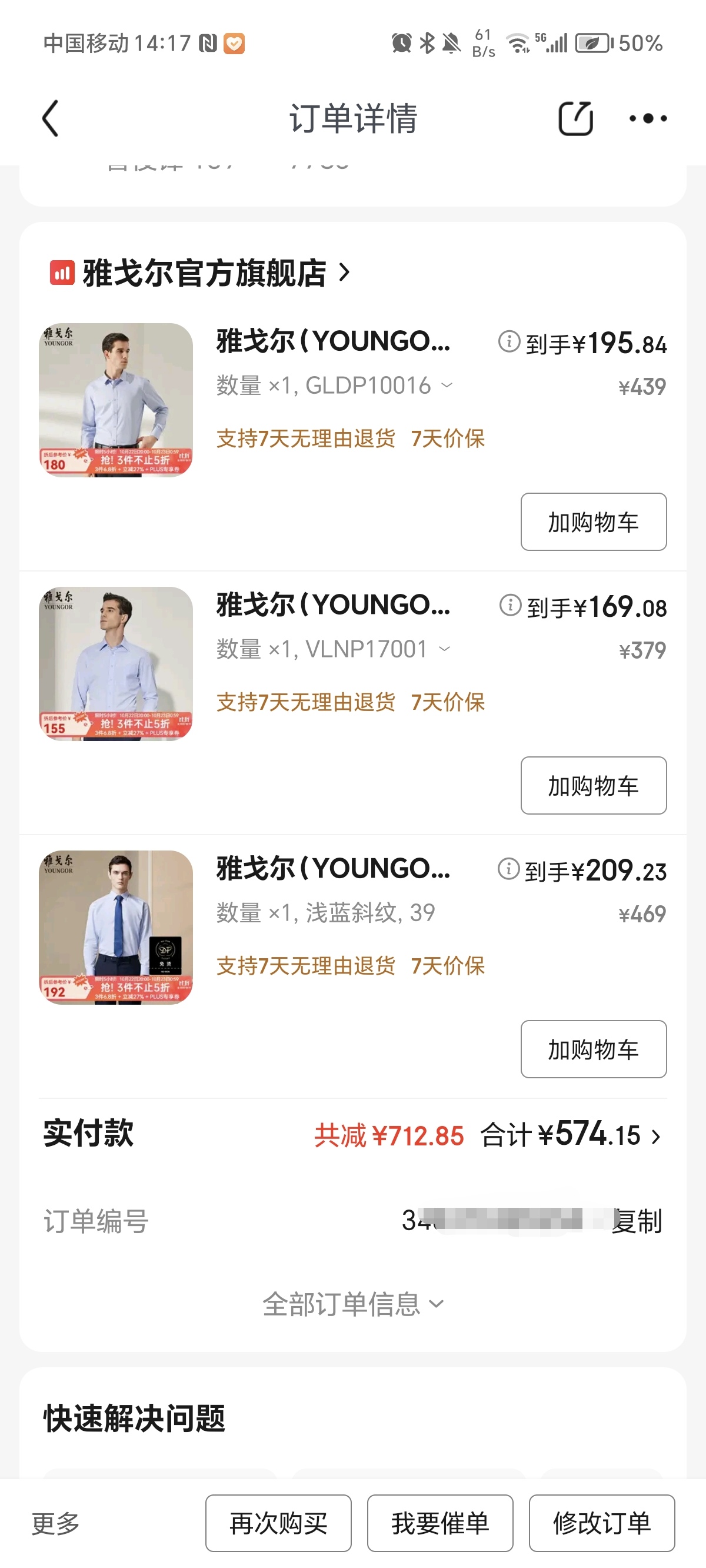 如果商品不是单一,是有多个商品选一的,一般下单后我会再次看买的是要买的那个,像单子上那几件,三件是三个网页多个款式中选出来的,所以这样情况,我会重新看每一件是不是其中选出来下单的。