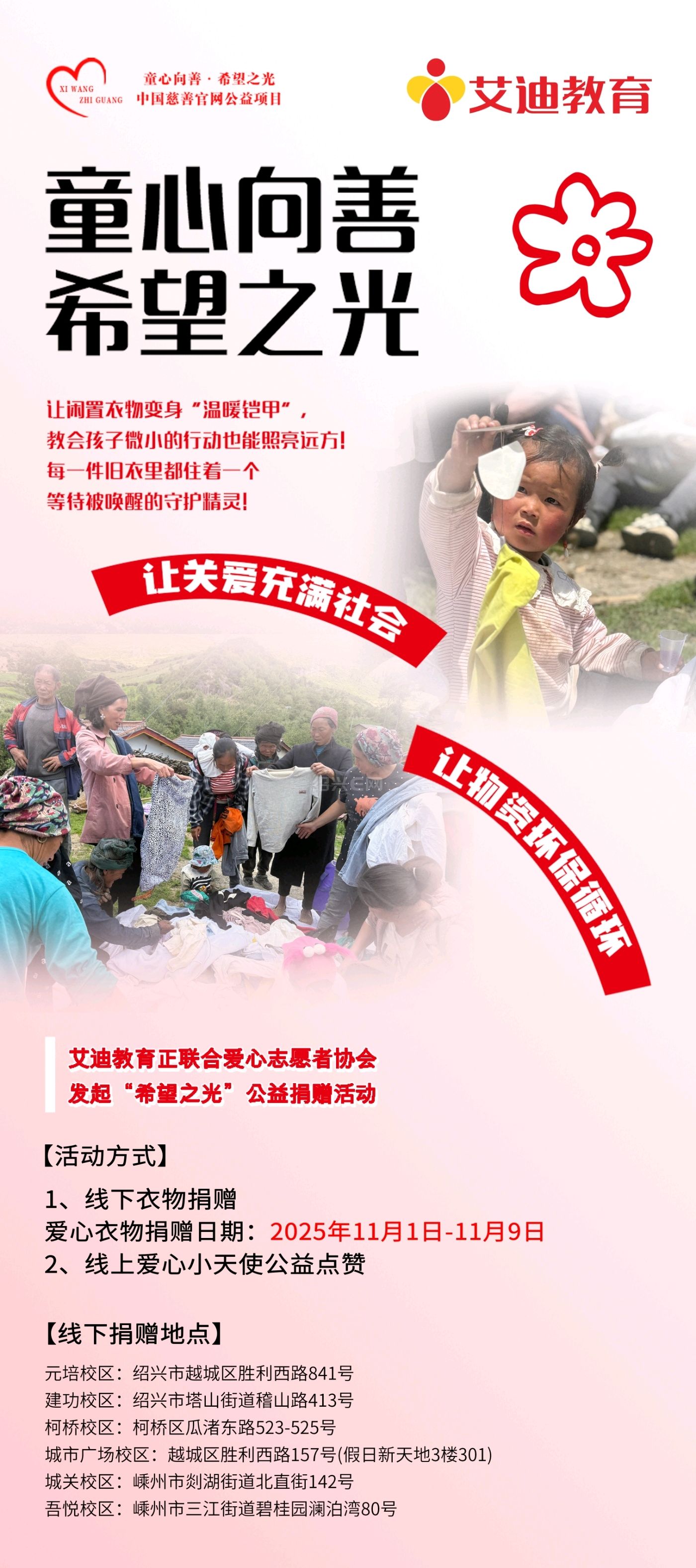 艾迪教育正联合爱心志愿者协会发起“希望之光”公益捐赠活动