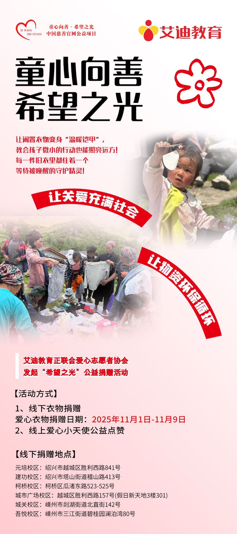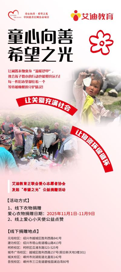 当寒冬来临,一件闲置的冬衣或许能成为他人抵御严寒的铠甲;当孩子成长,一件合身的旧衣或许能点亮他们纯真的笑脸。我们相信,每一件衣物都承载着温度,每一份善意都能汇聚成光!让关爱充满社会,让物资环保循环。艾迪教育正联合爱心志愿者协会发起“希望之光”公益捐赠活动