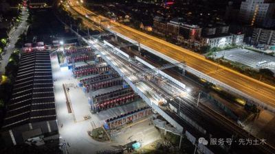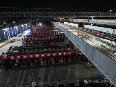 10月22日凌晨1时许,夜色中的浙江绍兴城际铁路柯桥站(杭州端)施工现场灯火通明。借助AI和PLC控制系统,经过80分钟的快速化连续顶推横移换梁作业,总重量达8000余吨的新旧桥梁被成功“置换”——旧桥梁“退役”废弃,新桥梁“上岗”履职。3个小时后,一列列车顺利驶过“更换”后的新桥梁。本次铁路仅封锁5小时就完成了整个桥梁的“移旧换新”,这项国内首例以毫米级偏差实现“无缝对接”的道岔连续梁换梁工程,如期圆满完成,不仅开创了铁路多跨桥梁快速更换新模式,更体现了我国铁路改造工程技术创新实力。