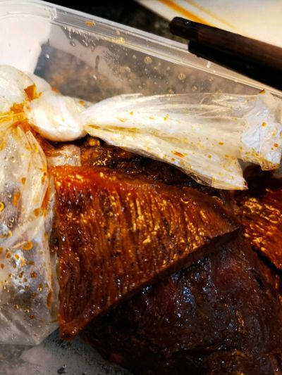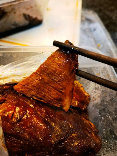 估计卤的时间太长了,或者是i放了好多天的,回过又回的牛肉,早已没有了本来肉的味道,只有卤汁和调理的味道。所以我基本上不买这种卤味,因为没法知道它的保质期多久。要吃就自己卤,虽然味道推板色,但放心。