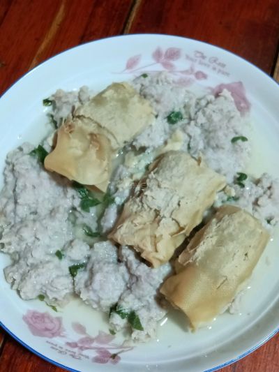:霉千张要摊开,不管断了还是碎了,肉要用少许盐打底,肉末里面拌入微微酱油调色,放少许鸡精,千张上面在放少许盐粒,大火高压锅出气蒸10分钟。