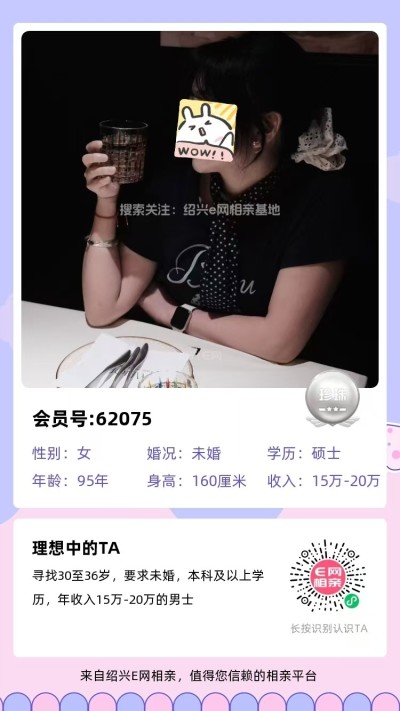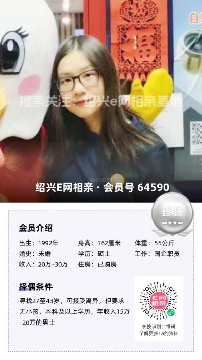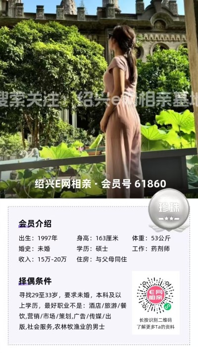 98年小姐姐,身材高挑匀称,美丽气质,落落大方。绍兴人在上海工作,独生女,硕士学历,设计师,年薪10-15万。父亲经商,绍兴和上海都有房,家境殷实。