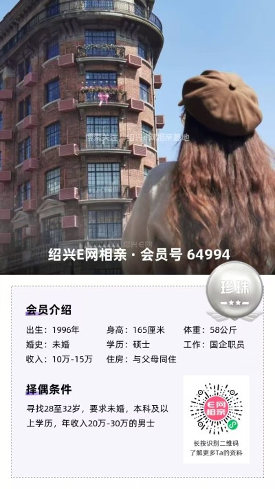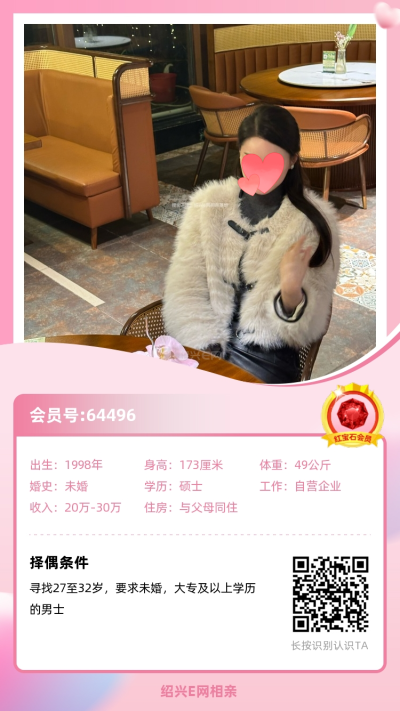 她想找32岁以下,大专及以上学历的未婚男生,想认识她可以私聊红娘+64496