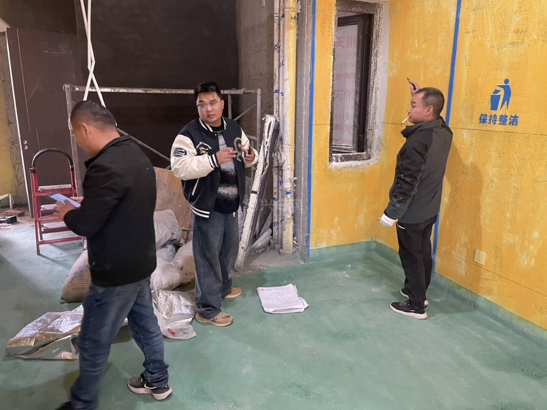项目经理和设计师现场讨论,认真负责!每天给业主发来现场施工图,每周日报告下周进度!